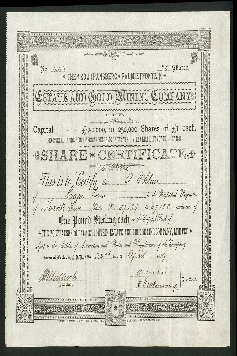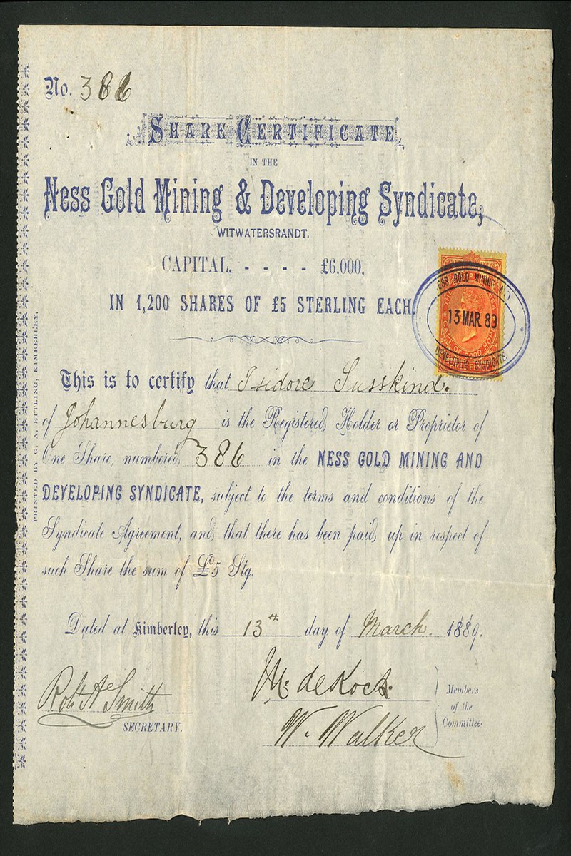 (x) Dominion Gold Reef Developing Syndicate, certificate for £1 shares issued to the 'General Manager, Deepkloof Gold Mining Company', Durban 1889, black with Natal revenue stamps, together with, Ness Gold Mining & Developing Syndicate, £5 shares, Kimberley 1889 with Cape of Good Hope revenue stamp, and Zoutpansberg Palmietfontein Estate & Gold Mining Company, £1 shares, Pretoria 188[9], very fine or better (3)