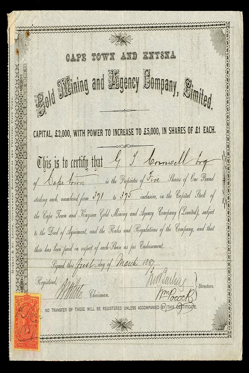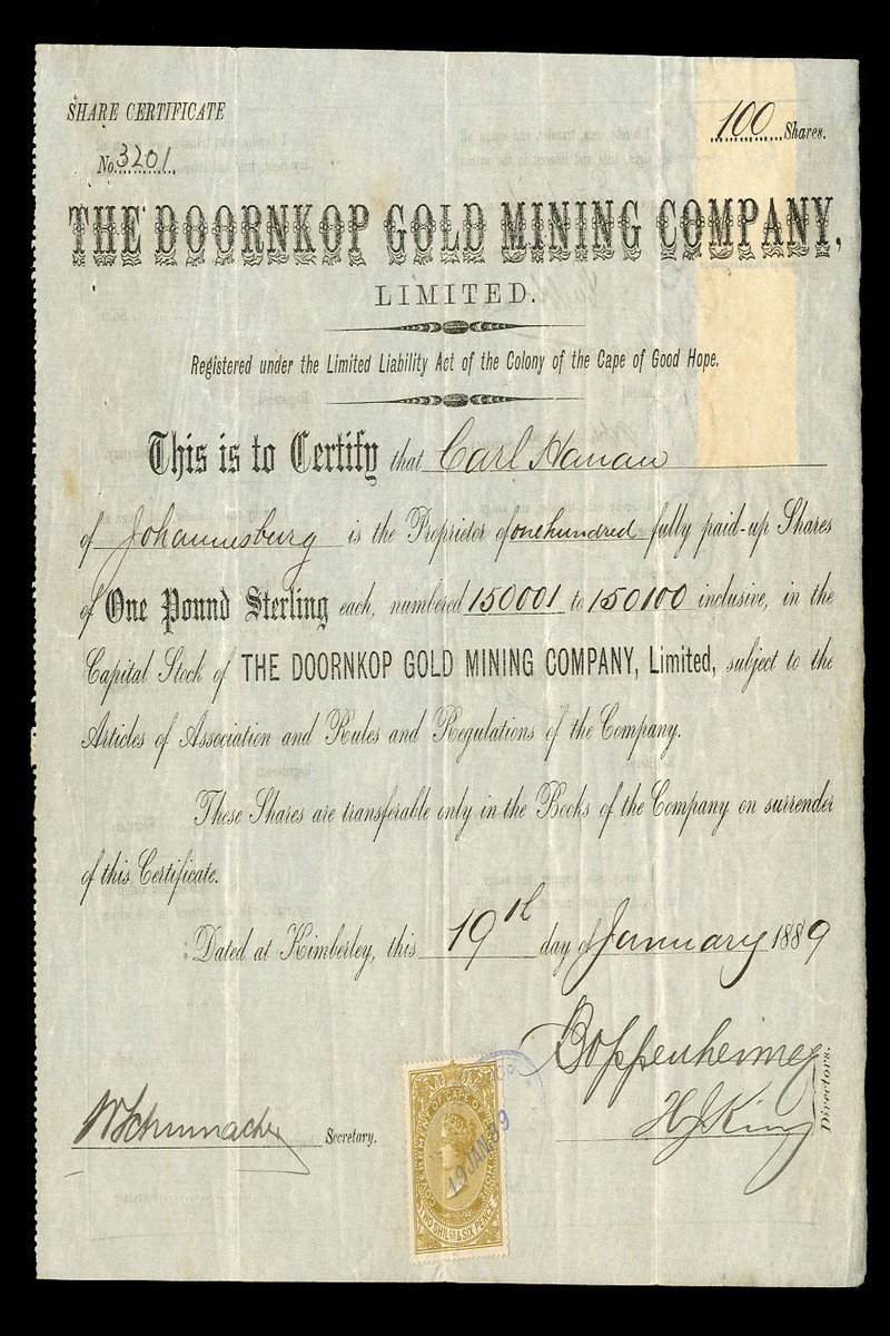 (x) Doornkop Gold Mining Company Ltd., £1 shares, Kimberley 188[9], black, signed by Bernard Oppenheimer, together with Cape Town & Knysna Gold Mining & Agency Company Ltd., 18[87] and Blue Rock (Sheba) Gold Mining Company Ltd., £1 shares, Cape Town 188[6], all with affixed revenue stamps, very fine or better (3)