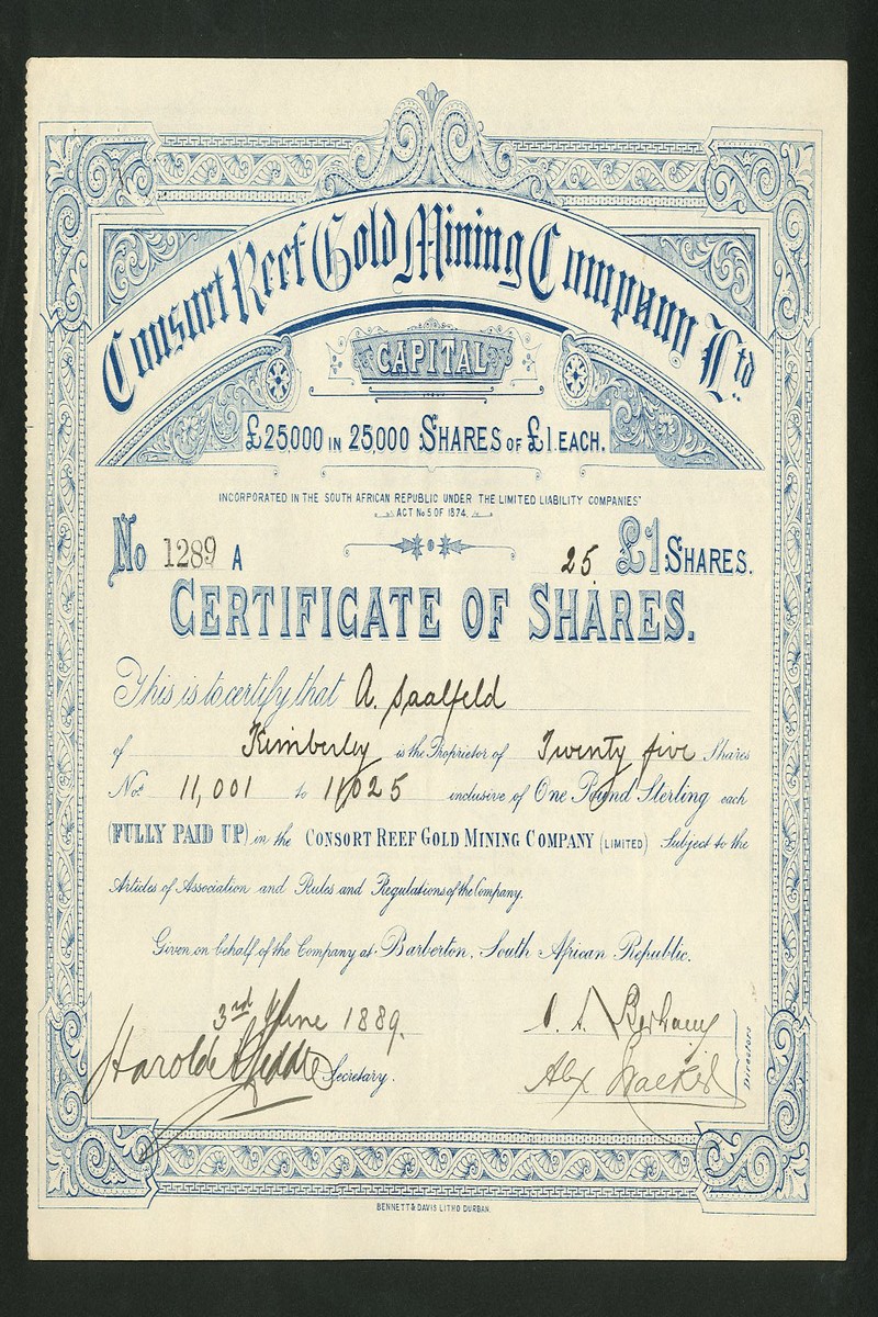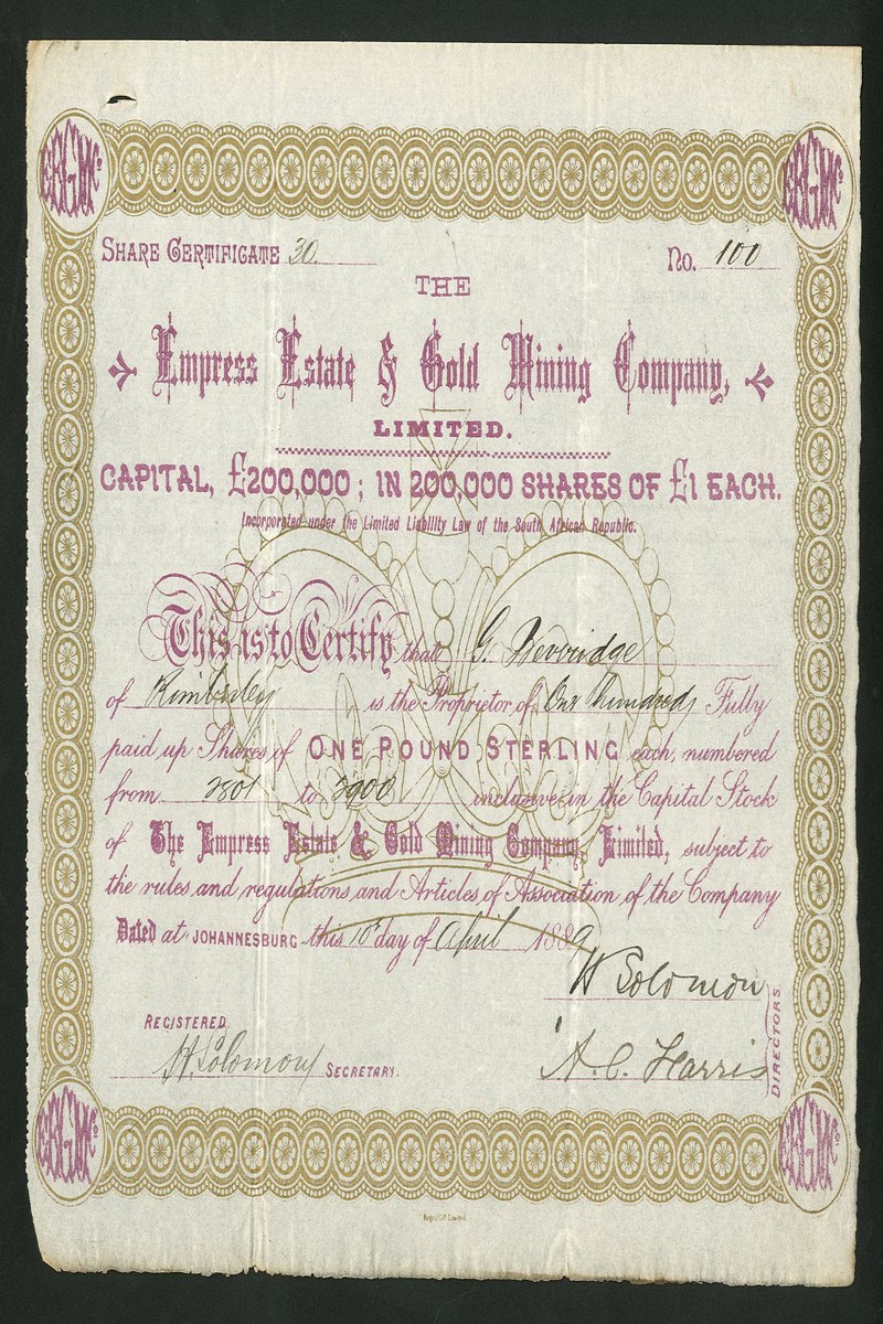 (x) Empress Estate & Gold Mining Company Ltd., certificate for £1 shares, Johannesburg 188[9], gold border together with 2 other gold minng shares, Royal Gold Mining Co., Johannesburg 188[8], gold border, and Consort Reef Gold Mining Co. Ltd., Barberton [1889], blue, good very fine (3)