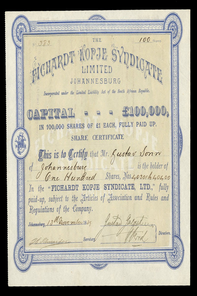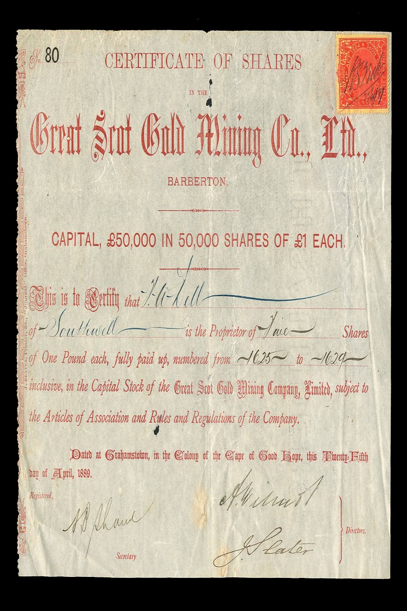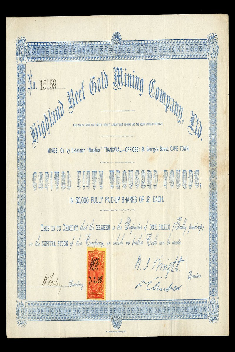 (x) Great Scot Gold Mining Co. Ltd., £1 shares, Grahamstown 1889, red with affixed revenue stamp, together with Highland Reef Gold Mining Company Ltd., bearer share, blue, date of 7th February 1888 handwritten on revenue stamp, and Fichardt Kopje Syndicate Ltd., £1 shares, Johannesburg 18[89], very fine (3)