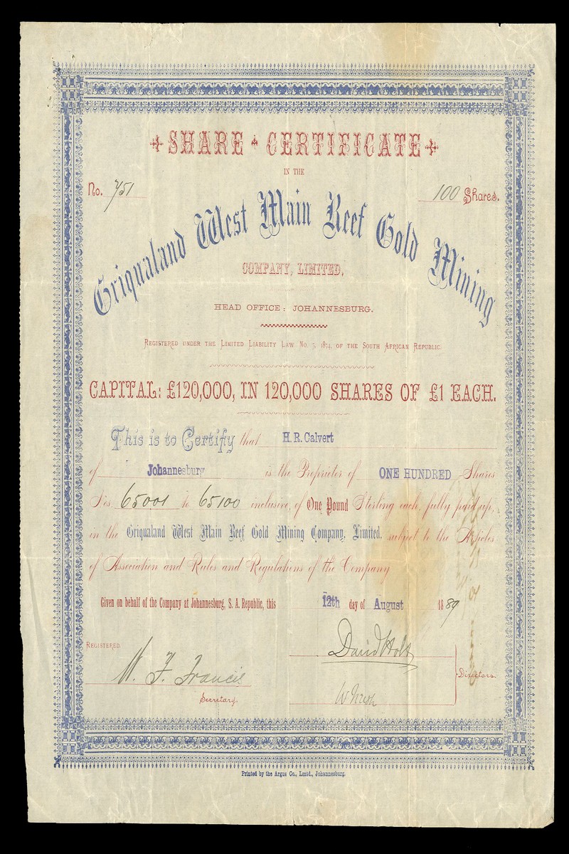 (x) Griqualand West Copper & Mineral Mining Syndicate Ltd., £1 shares, Kimberley 188[9], brown with revenue stamp affixed, issued to and signed by Herman Hirsche, and Griqualand West Main Reef Gold Mining Co. Ltd., £1 shares, Johannesburg 18[89], blue border, blue and red text, generally very fine