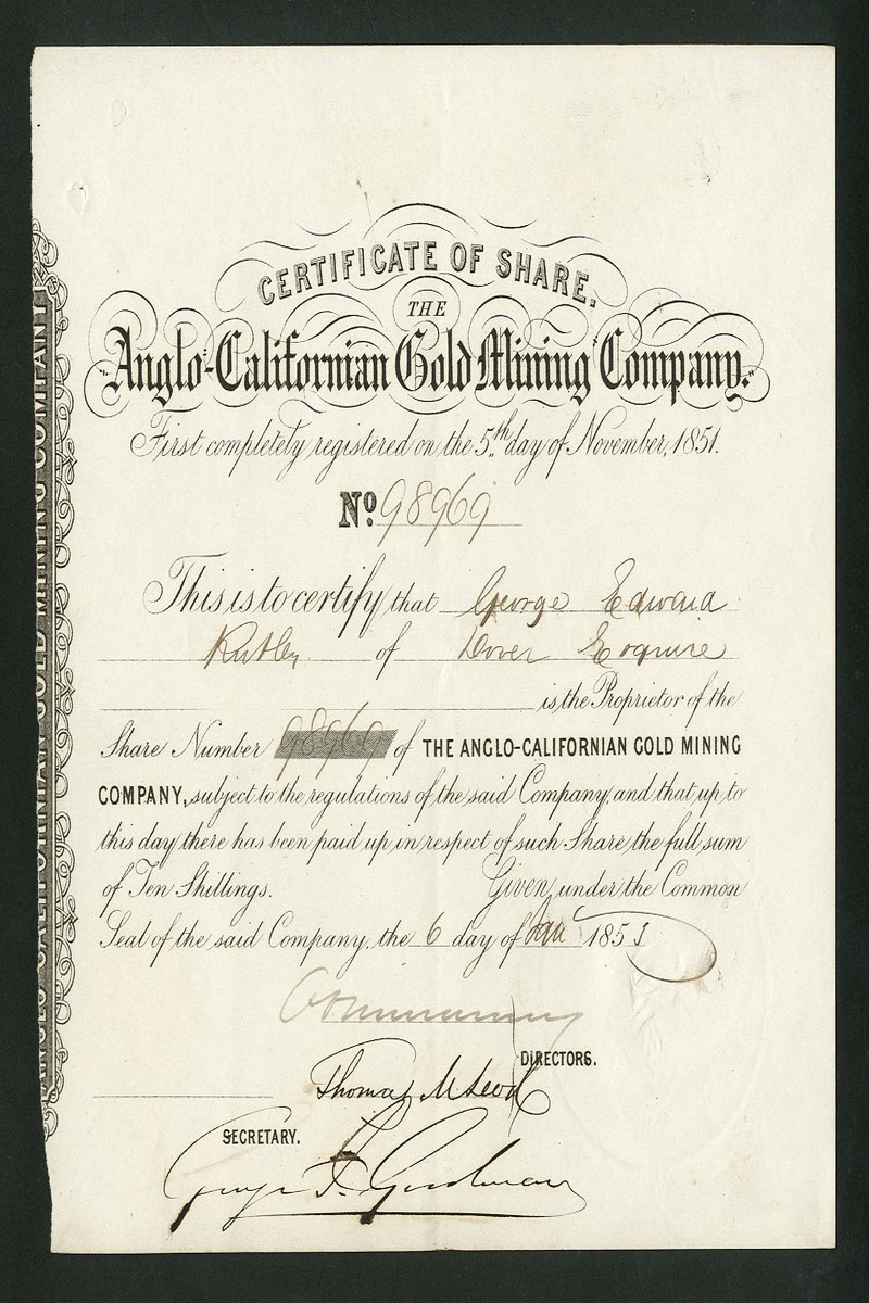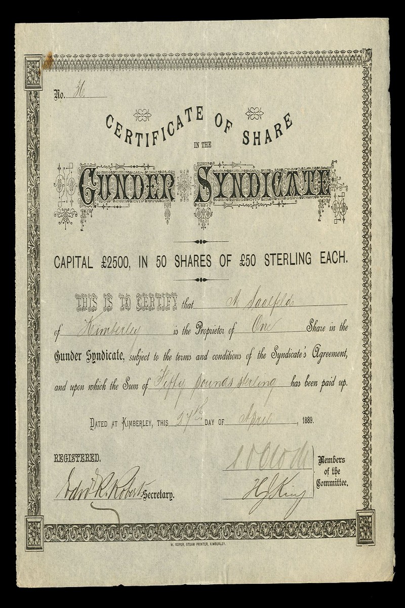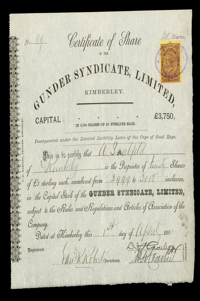 (x) Gunder Syndicate Ltd., £50 share certificate, one of 50 issued, Kimberley [1889], black, and another example but dated 189[1] when capital increased to 3,750 shares of £1 each, black with Cape of Good Hope revenue stamp good very fine (2)