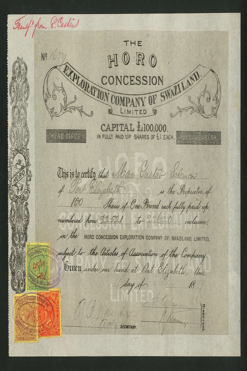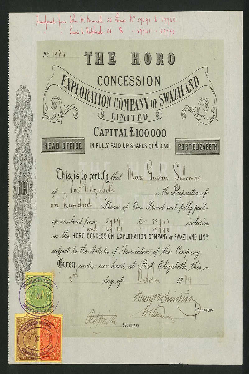 (x) Horo Concession Exploration Company of Swaziland Ltd., 2 types, black with grey and green underprints, both £1 shares and dated 18[89] Port Elizabeth, each with affixed revenue stamps, very fine or better (2)
