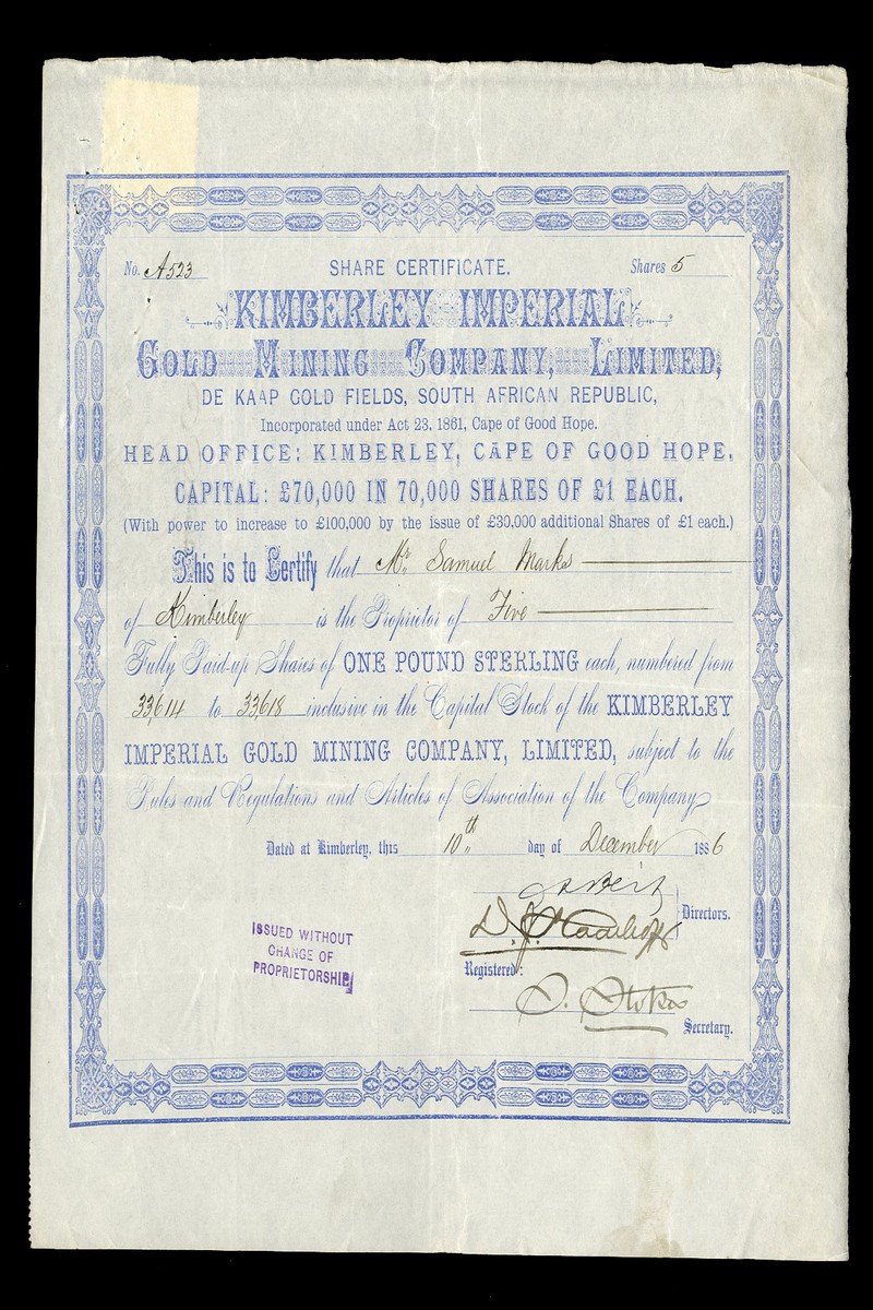 (x) Kimberley Imperial Gold Mining Company Ltd., £1 shares, Kimberley 188[6], blue, signed by Alfred Beit as a director and issued to Samuel Marks, extremely fine