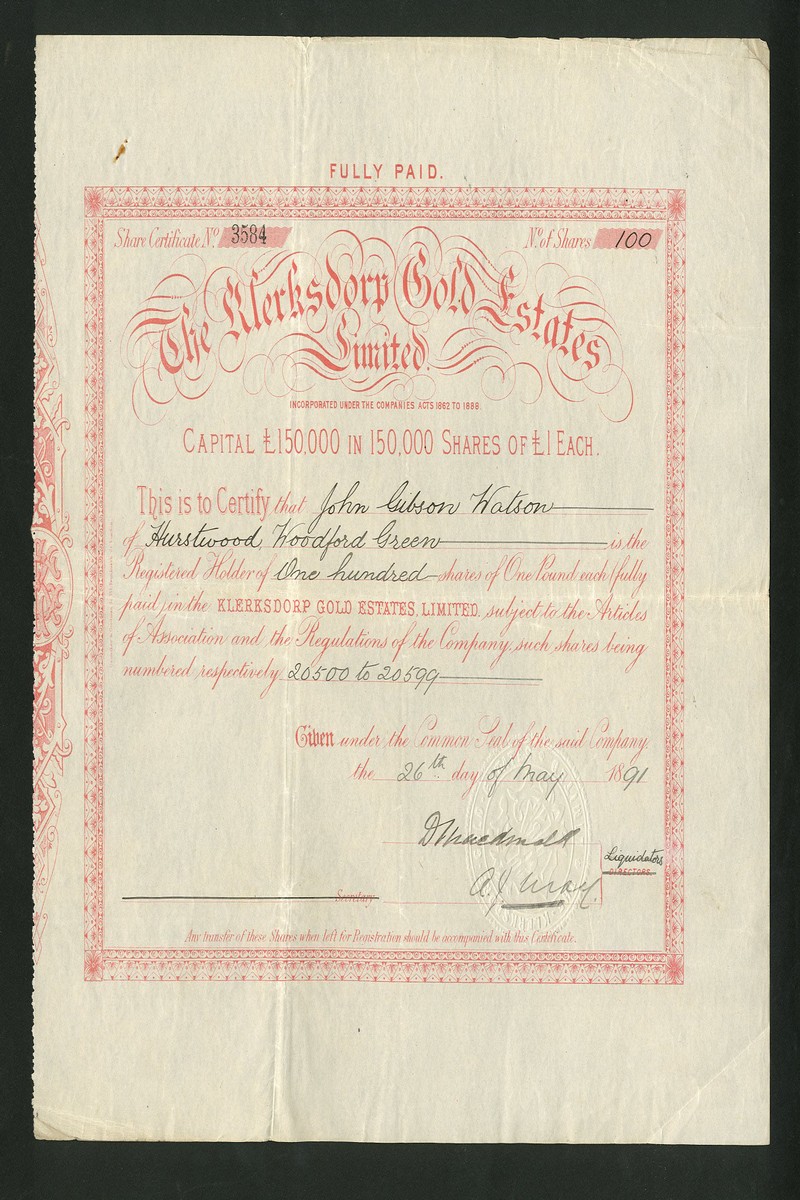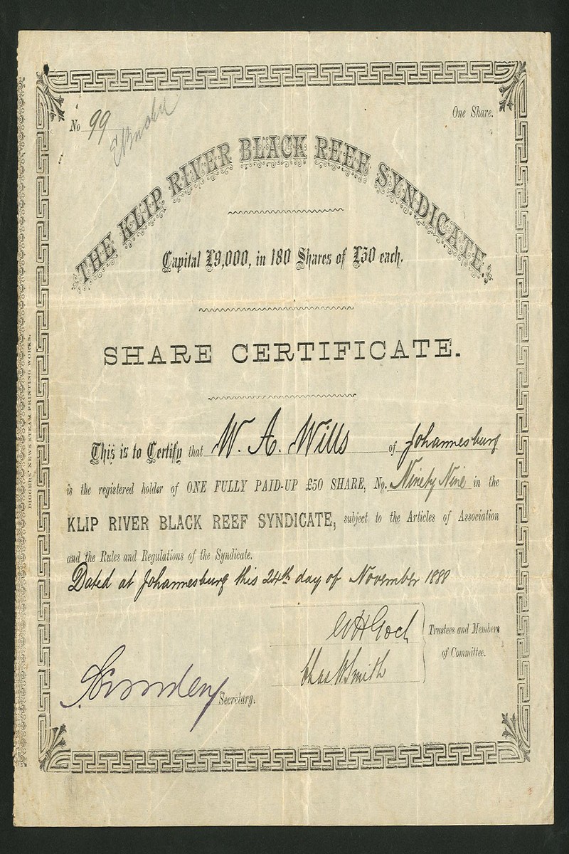 (x) Klip River Black Reef Syndicate, £50 share, Johannesburg [1888], no. 99, of 180 issued, black, together with Sun (Black Reef) Gold Mining Co. Ltd., £1 shares fully paid, Johannesburg 188[9], green border red and green printing, and Klerksdorp Gold Estates Ltd., £1 shares dated 18[91], red, very fine (3)