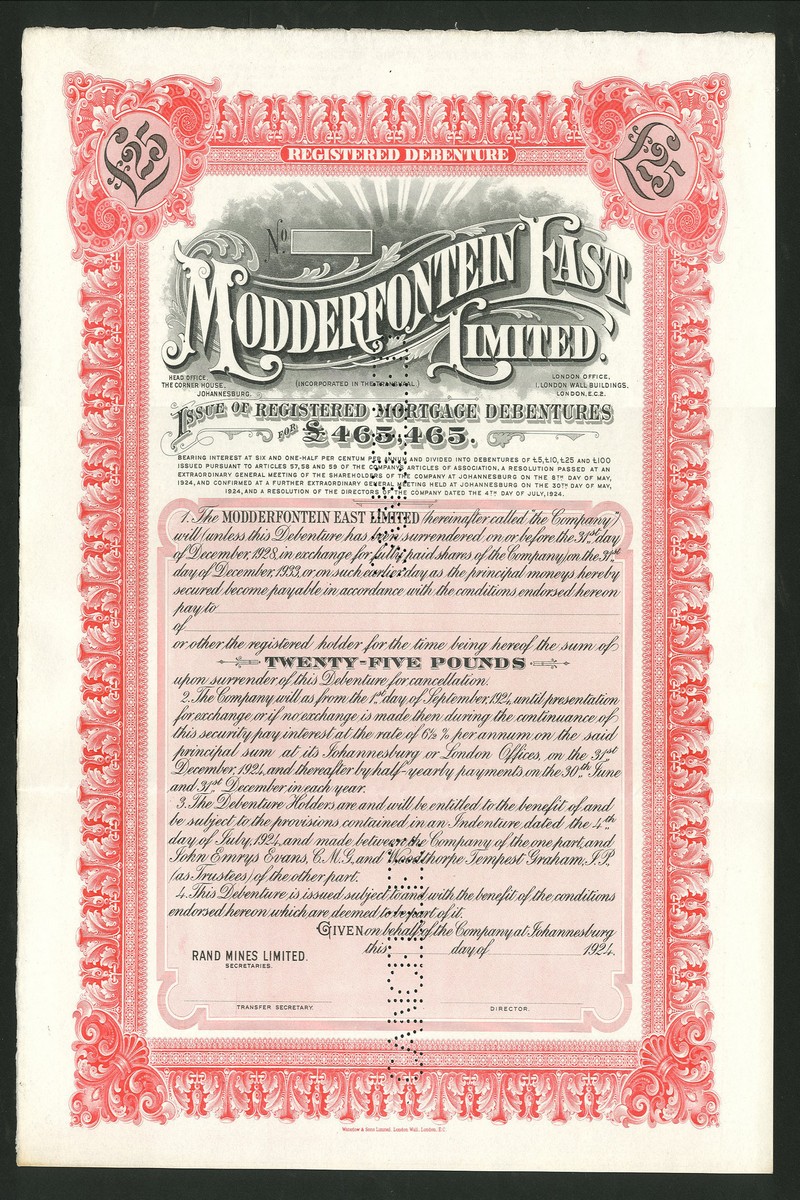 (x) Modderfontein East Limited, group of certificates including 3 unissued debentures for £5 (blue), £10 (green) and £25 (red), dated 1924, printed by Waterlow & Sons, hole cancelled; a further unissued registered debenture dated 1921, brown, and an Option Certificate for 100 shares, 1917, red, generally extremely fine (5)