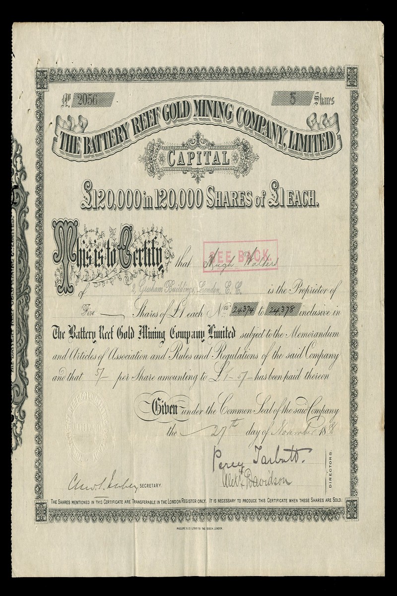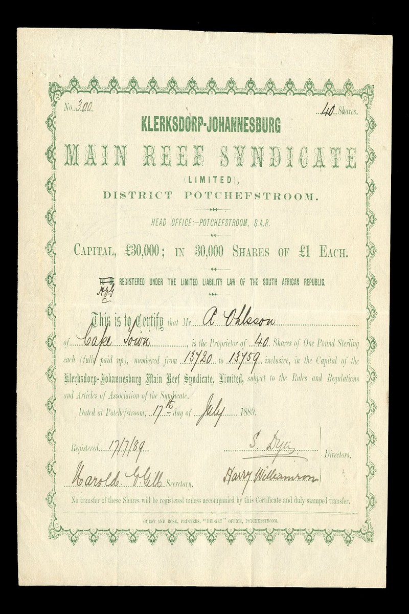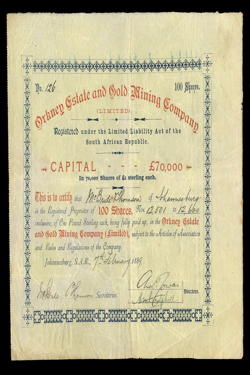 (x) Orkney Estate and Gold Mining Company Ltd., £1 shares, Johannesburg 188[9], blue and red on yellow paper, together with Klerksdorp-Johannesburg Main Reef Syndicate Ltd., £1 shares, Potchefstroom 1889, and Battery Reef Gold Mining Company Ltd., £1 shares dated 18[88], black, generally very fine (3)