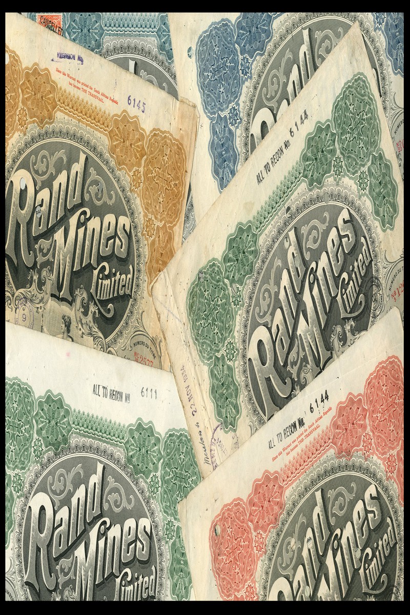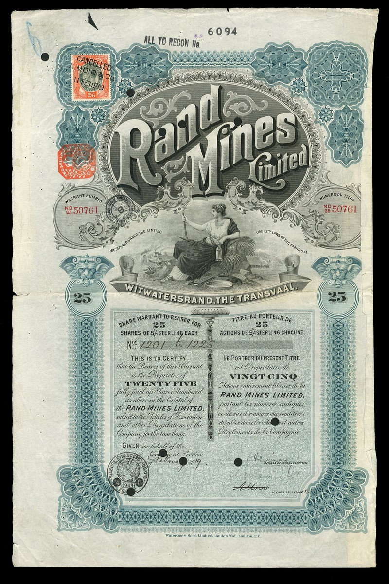 (x) Rand Mines Limited, group of bearer certificates for 1, 5 (3), 10 (2) and 25 (2) shares, dated 19[01]-19[27], London, vignette of allegorical figure, printed by Waterlow & Sons, various colours, hole cancelled, fine to very fine (8)