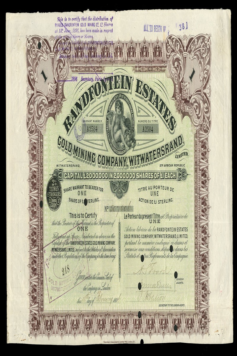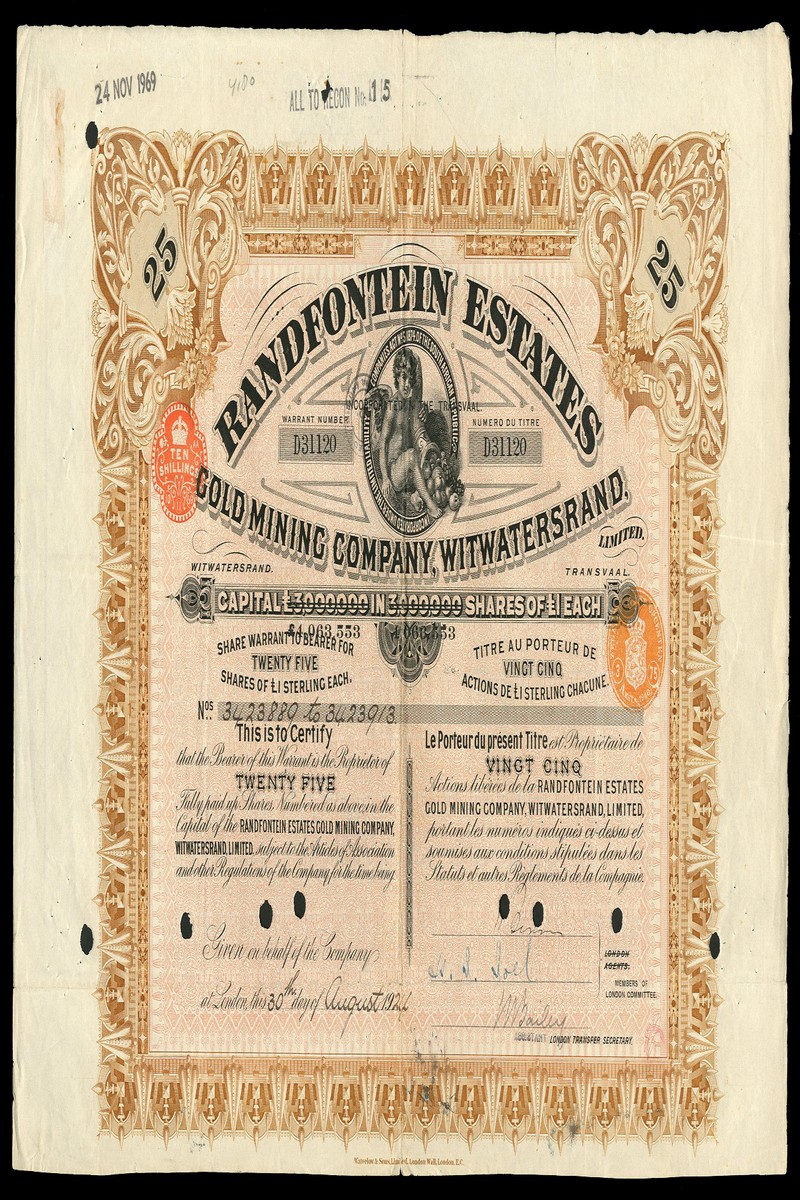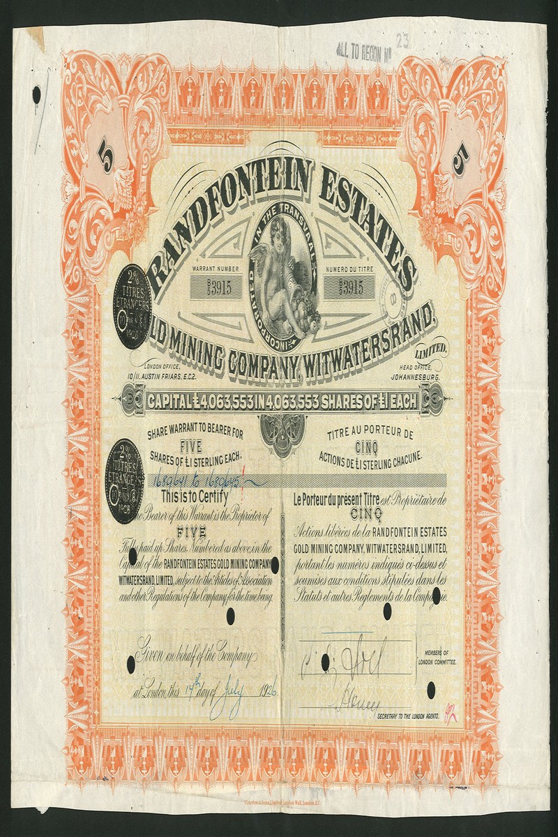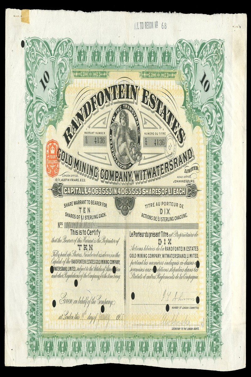 (x) Randfontein Estates Gold Mining Company Ltd., a group of bearer share warrants for 1,5, 10 and 25 shares, London 189[6] - 19[35], printed by Waterlow & Sons, various colours, decorative borders, hole cancelled, generally very fine (5)