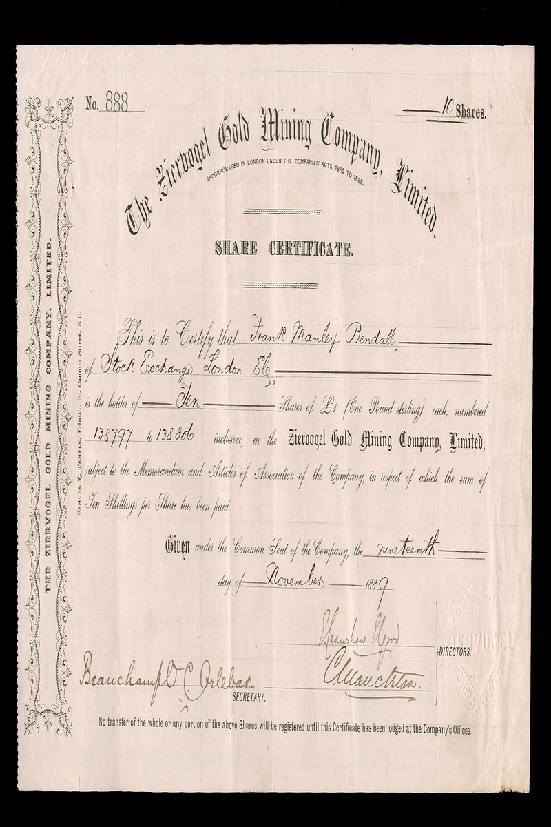(x) Rietkuil Kopje Gold Mining Company Ltd., £1 shares, Kimberley 188[9], black, together with Forest Creek Gold Mining Company Ltd., £1 shares, Mossel Bay 188[7], brown with affixed revenue stamp, slightly damaged left hand side, and Zierbogel Gold Mining Company Ltd., £1 shares 188[9], generally very fine unless noted (3)