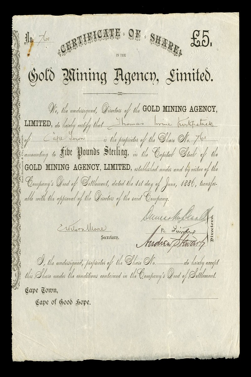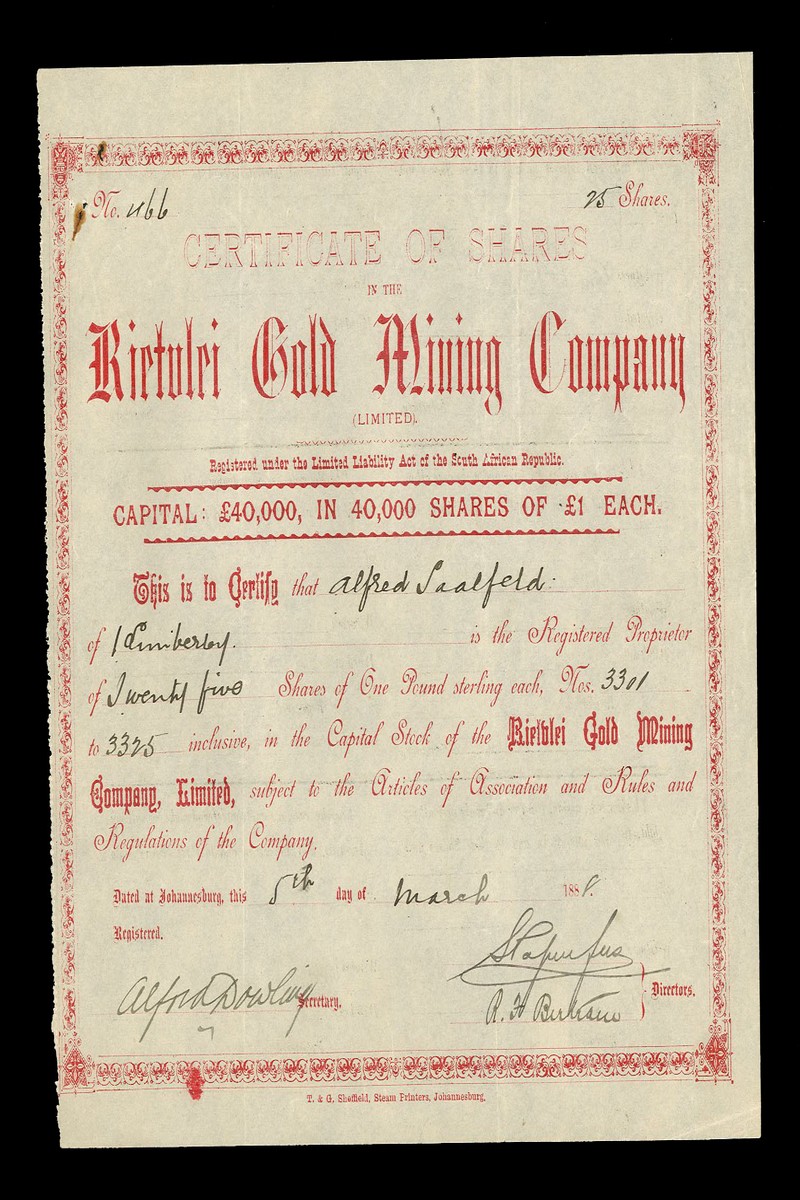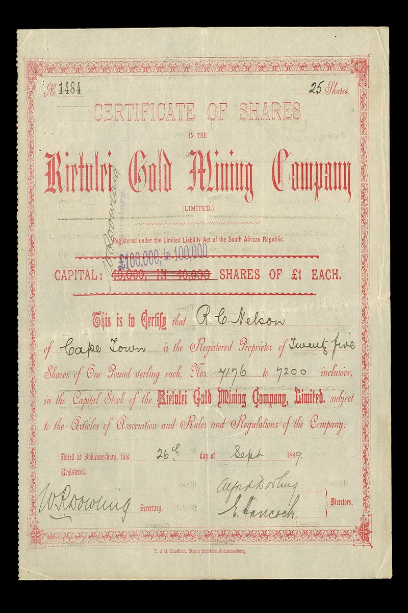 (x) Rietulei Gold Mining Company Ltd., pair of £1 share certificates, red, dated 188[8] and 188[9] Johannesburg, later certifcate overprinted to reflect increased capital from £40,000 to £100,000, and, Gold Mining Agency Ltd., £5 shares dated 1886 and numbered 761, black, very fine (3)