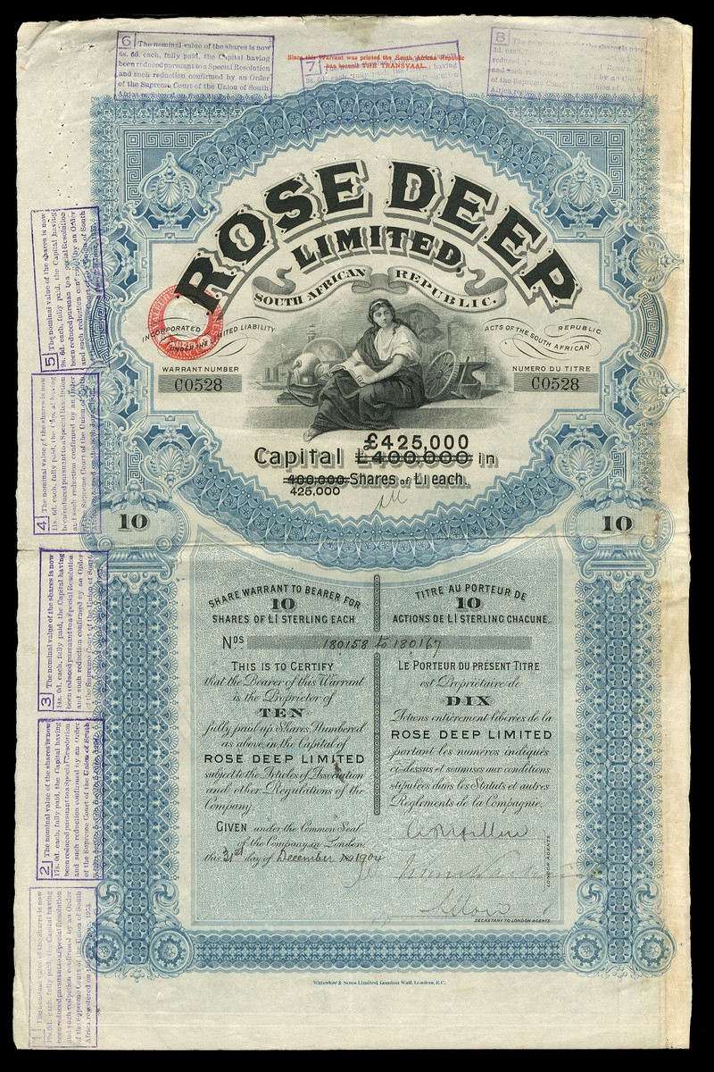 (x) Rose Deep Ltd., a set of 3 bearer certificates for £1 shares, all with capital overprinted £425,000, comprising 1 share, 189[9], no.A0050, 5 shares, 189[9], no.B0041 and 10 shares, 189[904], no.C0528, all with allegorical female in centre, text in English and French, green, red and blue respectively, printed by waterlow and Sons, with coupons, a few edge splits, fine to very fine. (3)