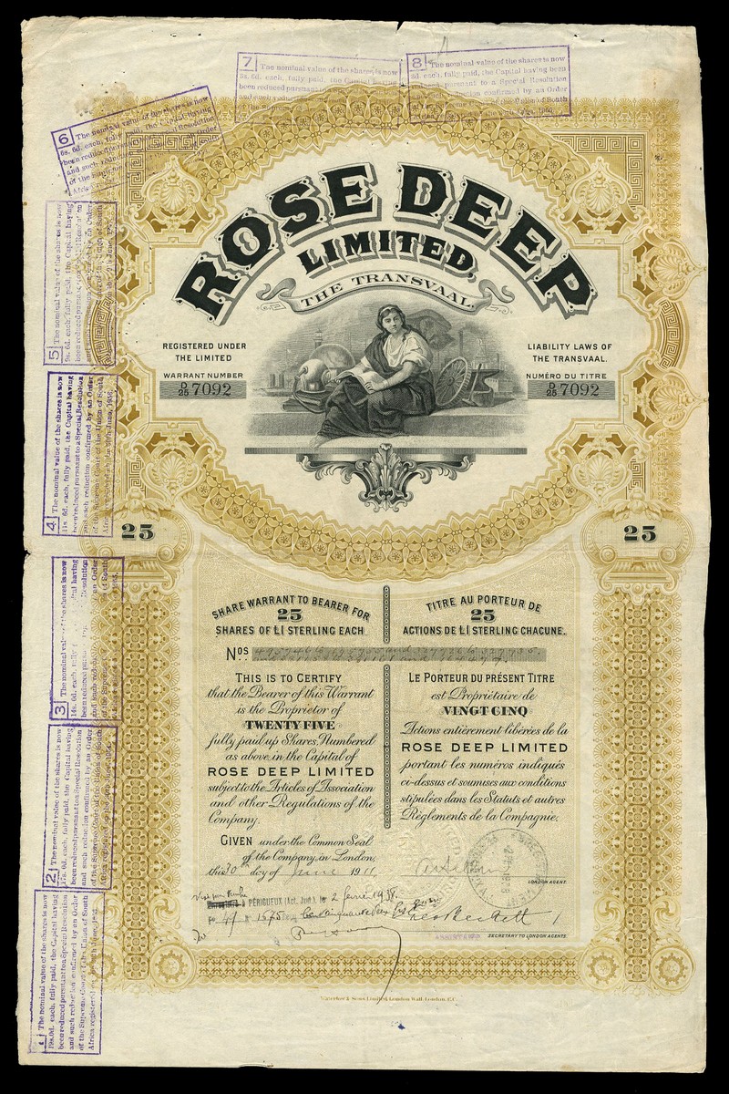 (x) Rose Deep Ltd., a group of 3 bearer certificates for £1 shares, no capital shown on face, comprising 1 share, 19[11], no.A/1 5138, 5 shares, 19[25], no.B/5 3215 and 25 shares, 19[11], no.D/25 7092, all with allegorical female in centre, text in English and French, green, red and orange-brown respectively, printed by Waterlow and Sons, with coupons, very fine and better. (3)