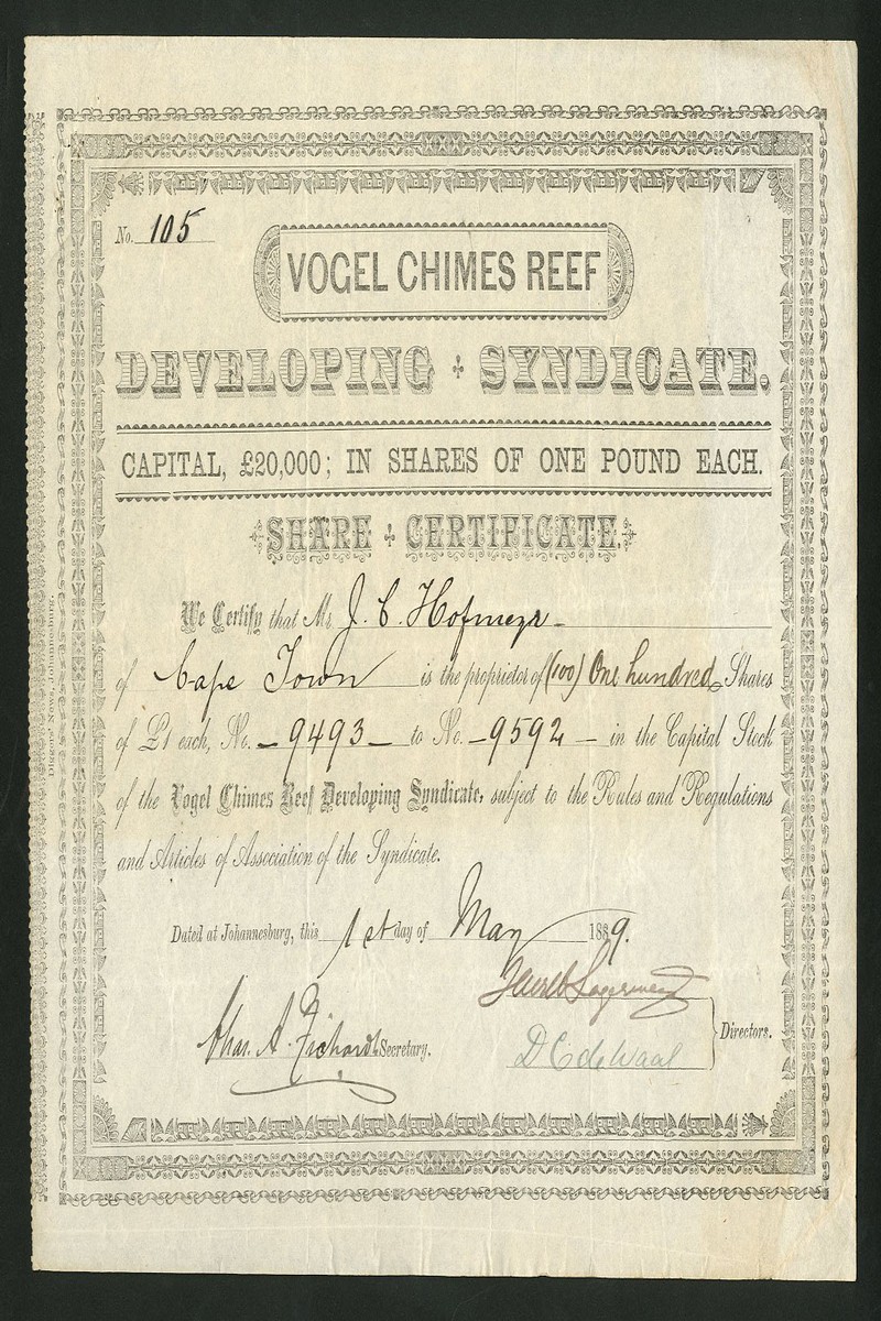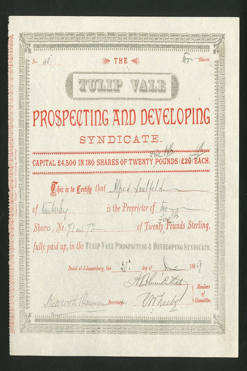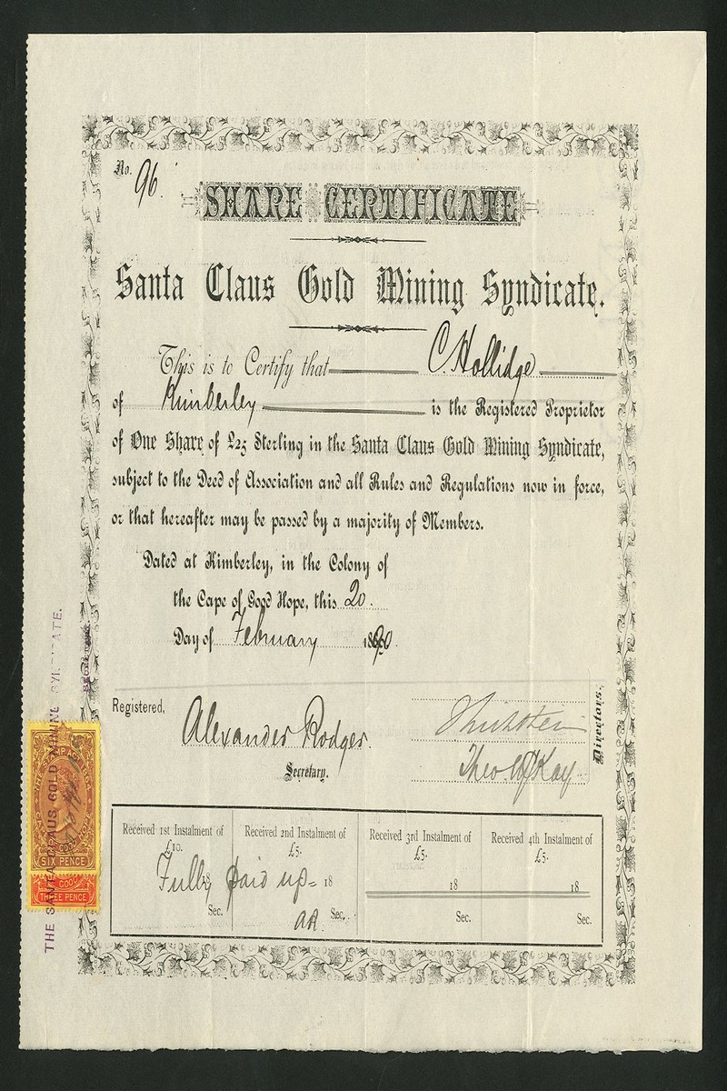 (x) Santa Claus Gold Mining Syndicate, certificate for £25 share, Kimberley 18[90], black, Cape of Good Hope revenue stamps togeher with Tulip Vale Prospecting & Developing Syndicate, £20 share certificate, Johannesburg 188[9] red and gold, and Vogel Chimes Reef Developing Syndicate, £1 shares, Johannesburg 188[9], grey, very fine or better (3)