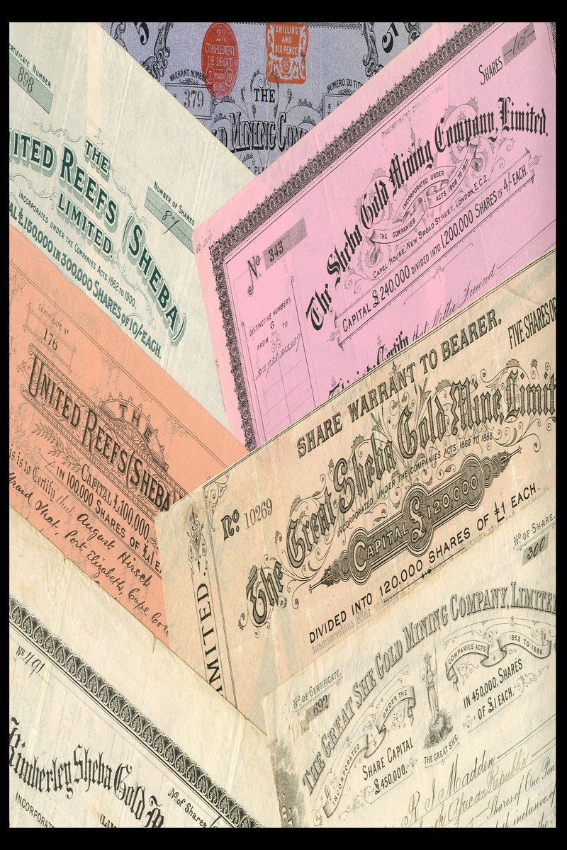 (x) Interesting collection of Sheba related Material, comprising: Great She Gold Mining Company Ltd., £1 shares dated 1888, vignete of "The Great She", black; Kimberley Sheba Gold Mining Co., Barberton 1887; Great Sheba Gold Mine Ltd., £1 bearer share with coupons, trimmed edges, 1889; United Reefs (Sheba) Ltd., shares of 16 shillings each, 18[99] on pink paper; Sheba Gold Mining Company, 4 shilling shares, registered London, 1924, pink; United Reefs (Sheba) Ltd., 10 shilling shares, 1906, green; Sheba Hill Ltd., 5/- shares dated 189[6], black; Sheba Queen Gold and Exploration Ltd., 10/- preference shares 1905, green; Sheba Gold Mining Company<, £1 shares, 1894; and, Sheba Gold Mining Company Ltd., bearer certificate for 5 x £1 shares, text in English and French, London 18[95], generally very fine-good (10)