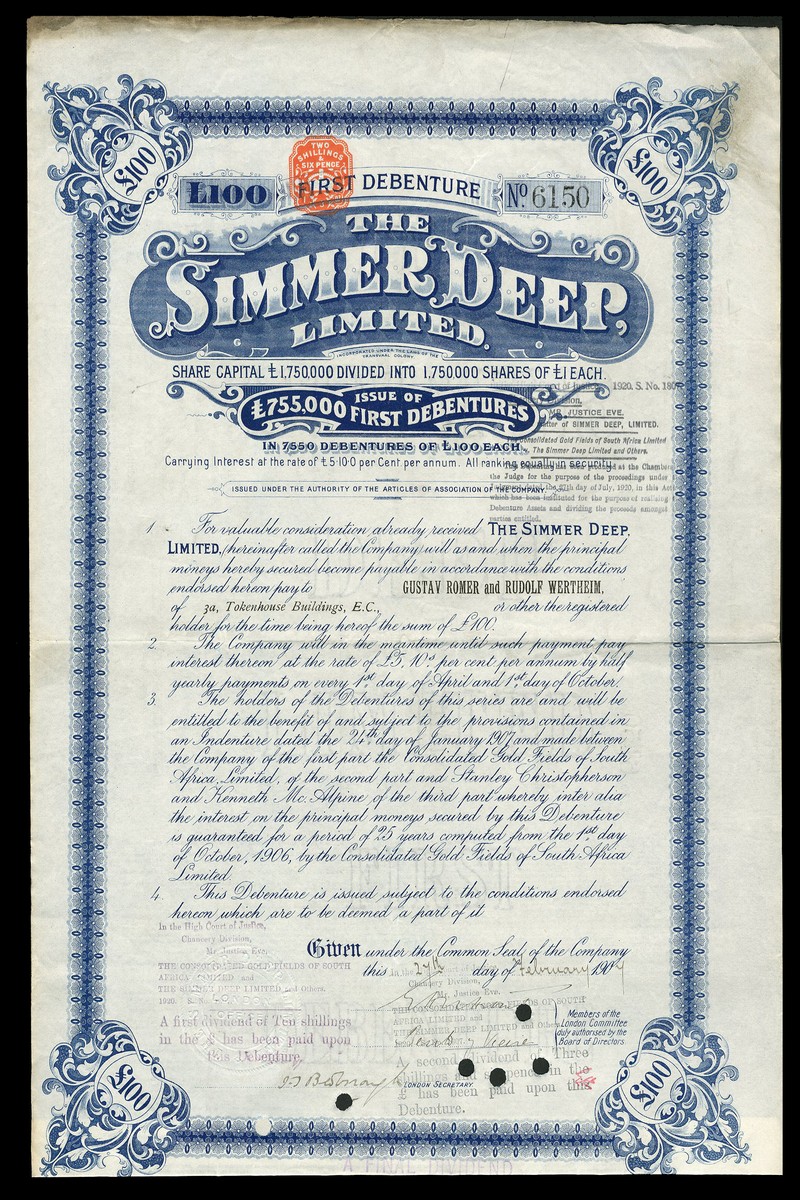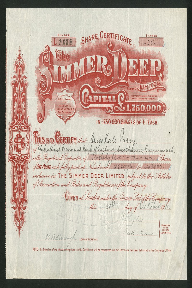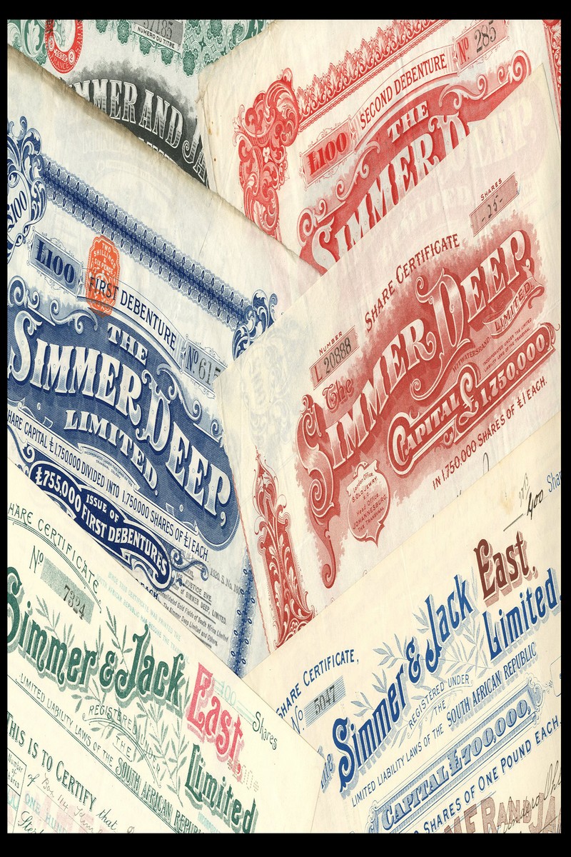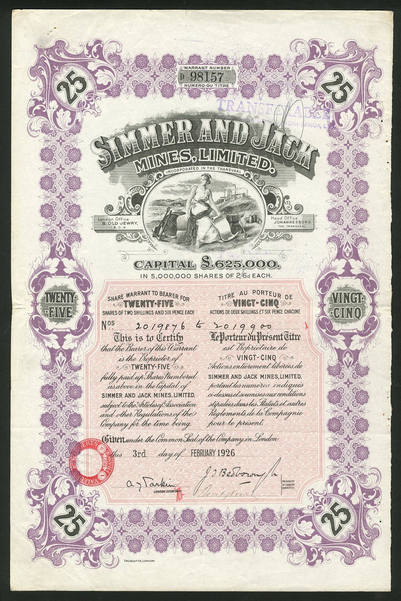 (x) Simmer & Jack East Ltd., Simmer Deep and Simmer & Jack Mines Ltd., a group of share certificates, debentures and share warrants including £1 shares dated 19[00]-19[11]; £100 debentures 190[7]; and, share warrants for 1, 5, 10 and 25 shares[1924]-[1938] various colours, fine or better (17)