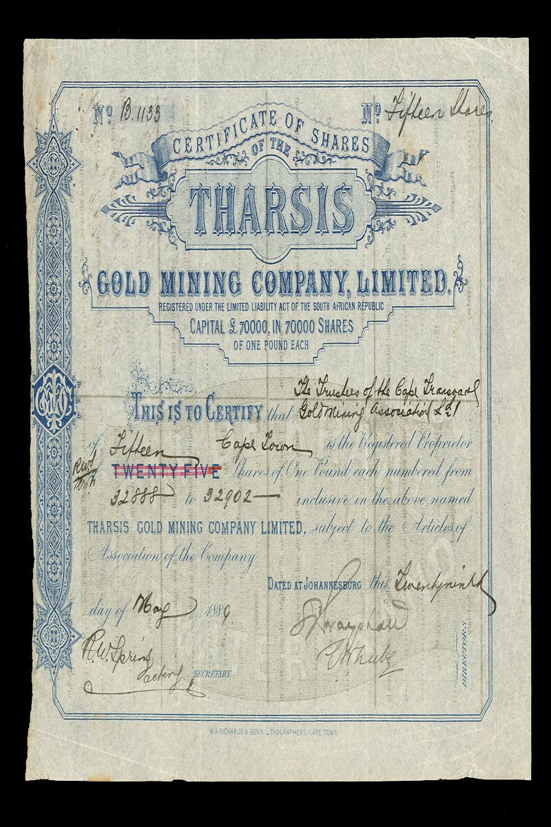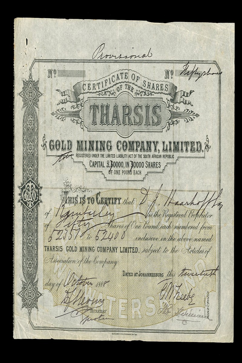 (x) Tharsis Gold Mining Company Ltd., pair of certificates for £1 shares, comprising one dated 188[8], capital £50,000 overwritten £70,000, brown underprint, and second dated 188[9] capital £70,000, blue, Johannesburg, generally very fine but some edge damage (2)