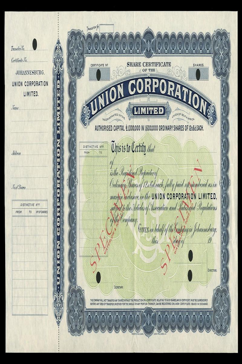 (x) Union Corporation Ltd., a specimen certificate for 12s 6d ordinary shares, 19- (circa 1920), printed by Waterlow & Sons, ornate border, blue with green underprint, overprinted specimem/ Waterlow & Sons in red on face, with counterfoil, near extremely fine.