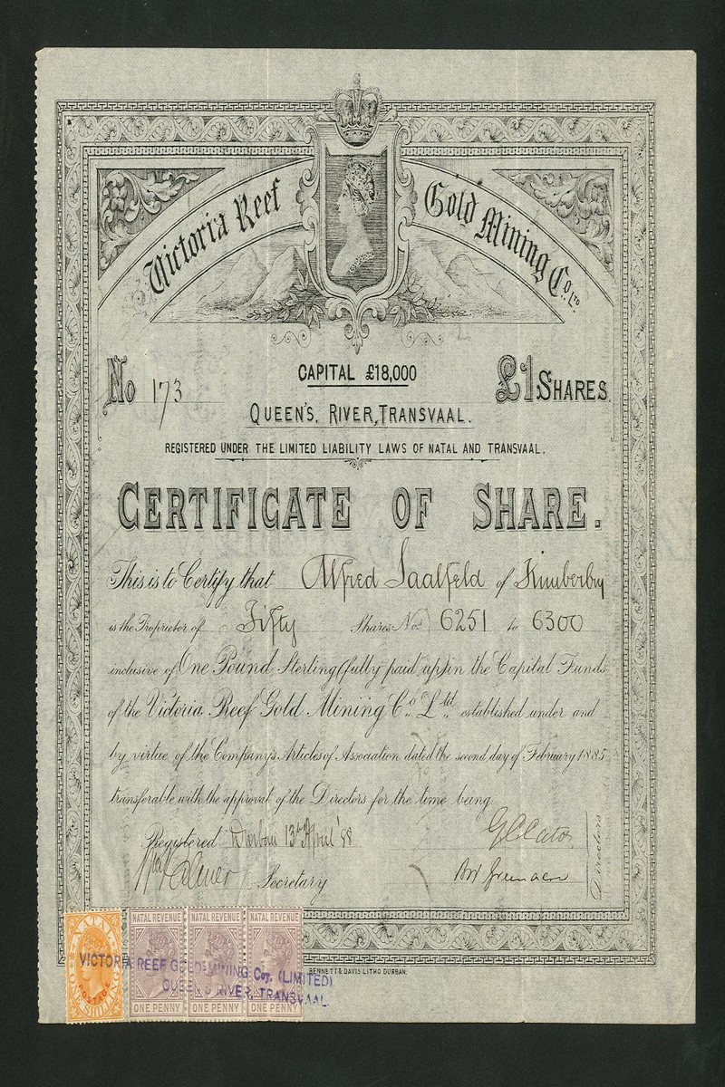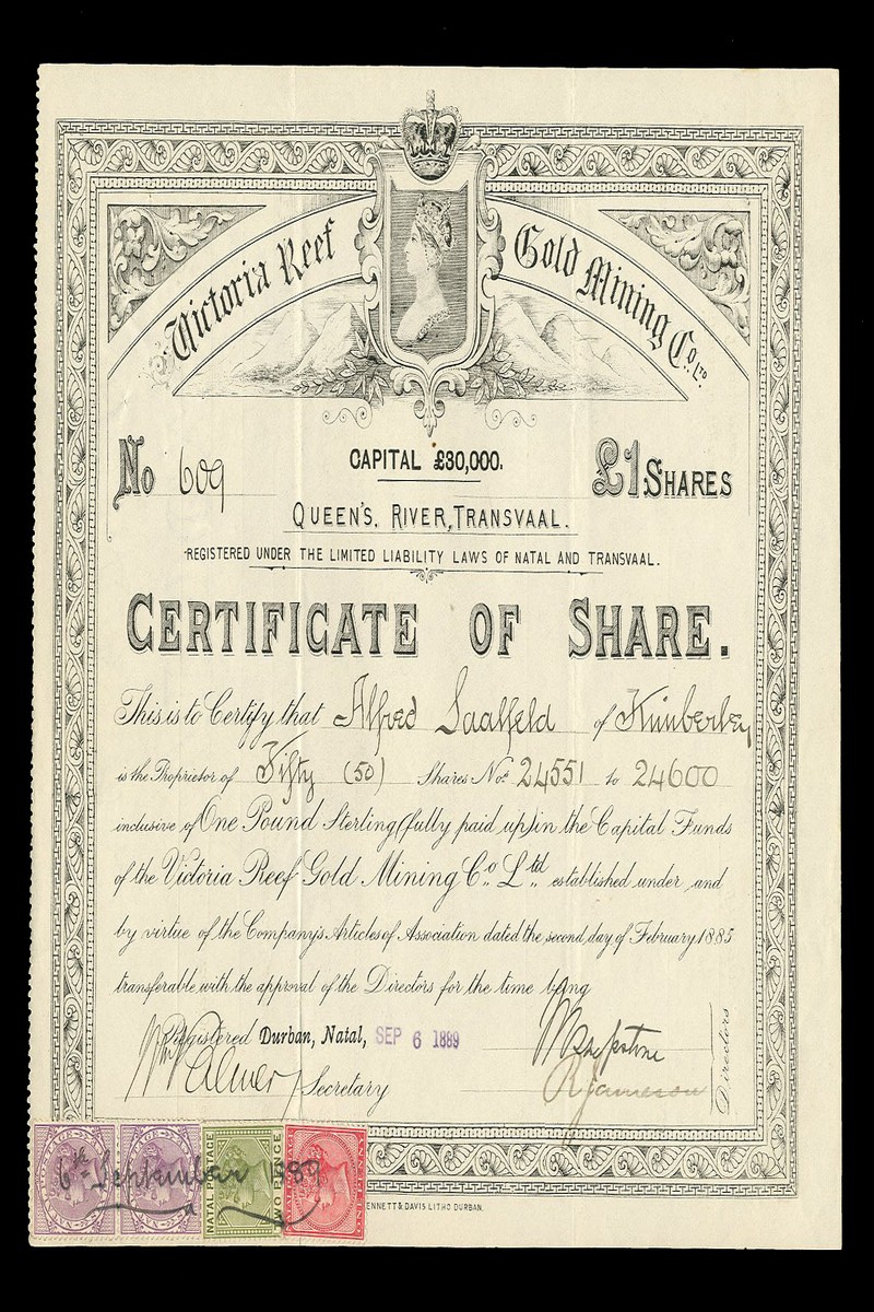 (x) Victoria Reef Gold Mining Co. Ltd., pair of £1 share certificates dated Durban 1888 (Capital £18,000) and 1889 (Capital £30,000), black with vignettes of Queen Victoria and affixed revenue stamps, very fine or better (2)