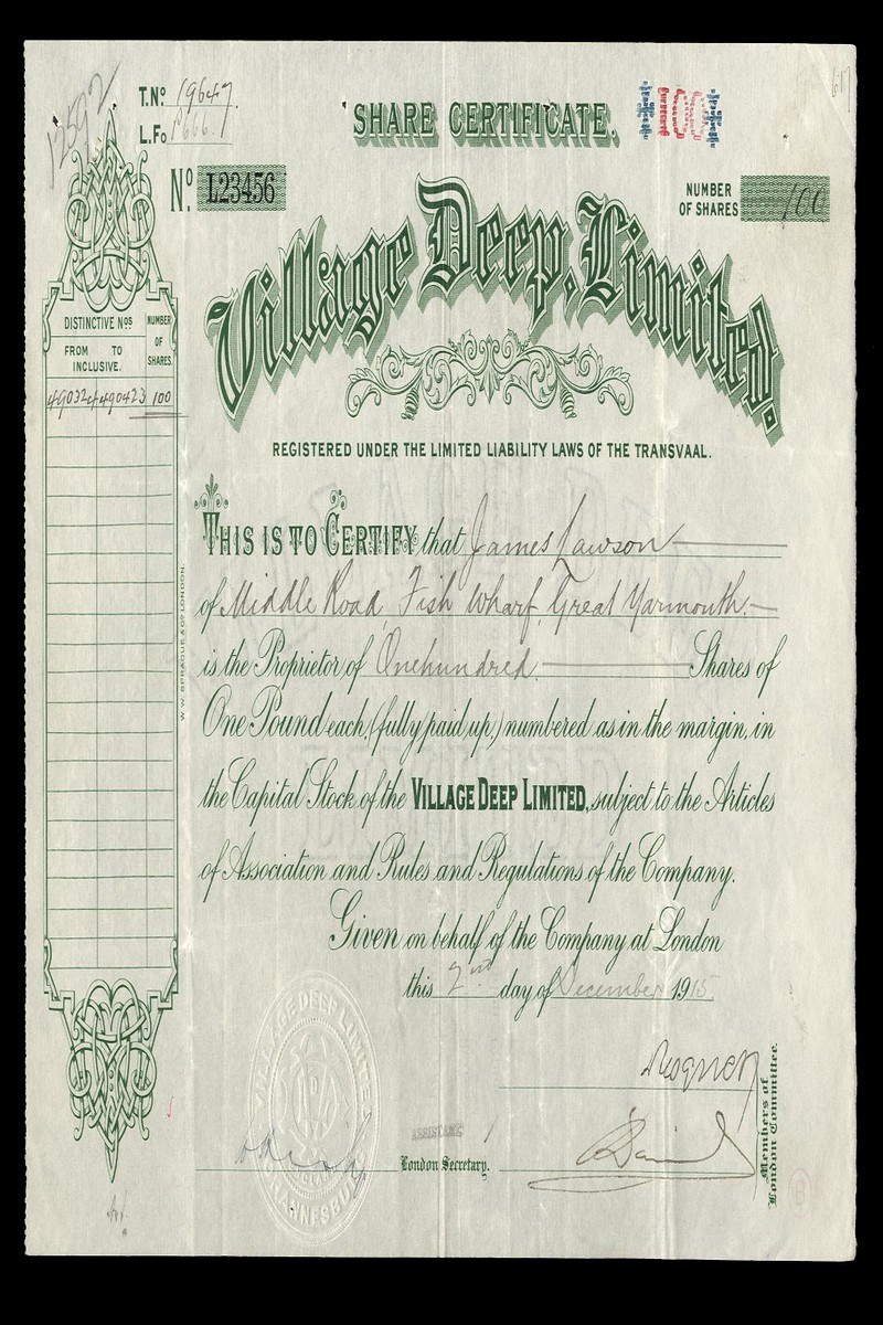 (x) Village Deep Limited., group of certificates relating to this company including £1 shares19[13] - 19[28], green and black, and large format bearer share warrant for 10 shares, London 1927, printed by Waterlow & Sons, brown, very fine (5)