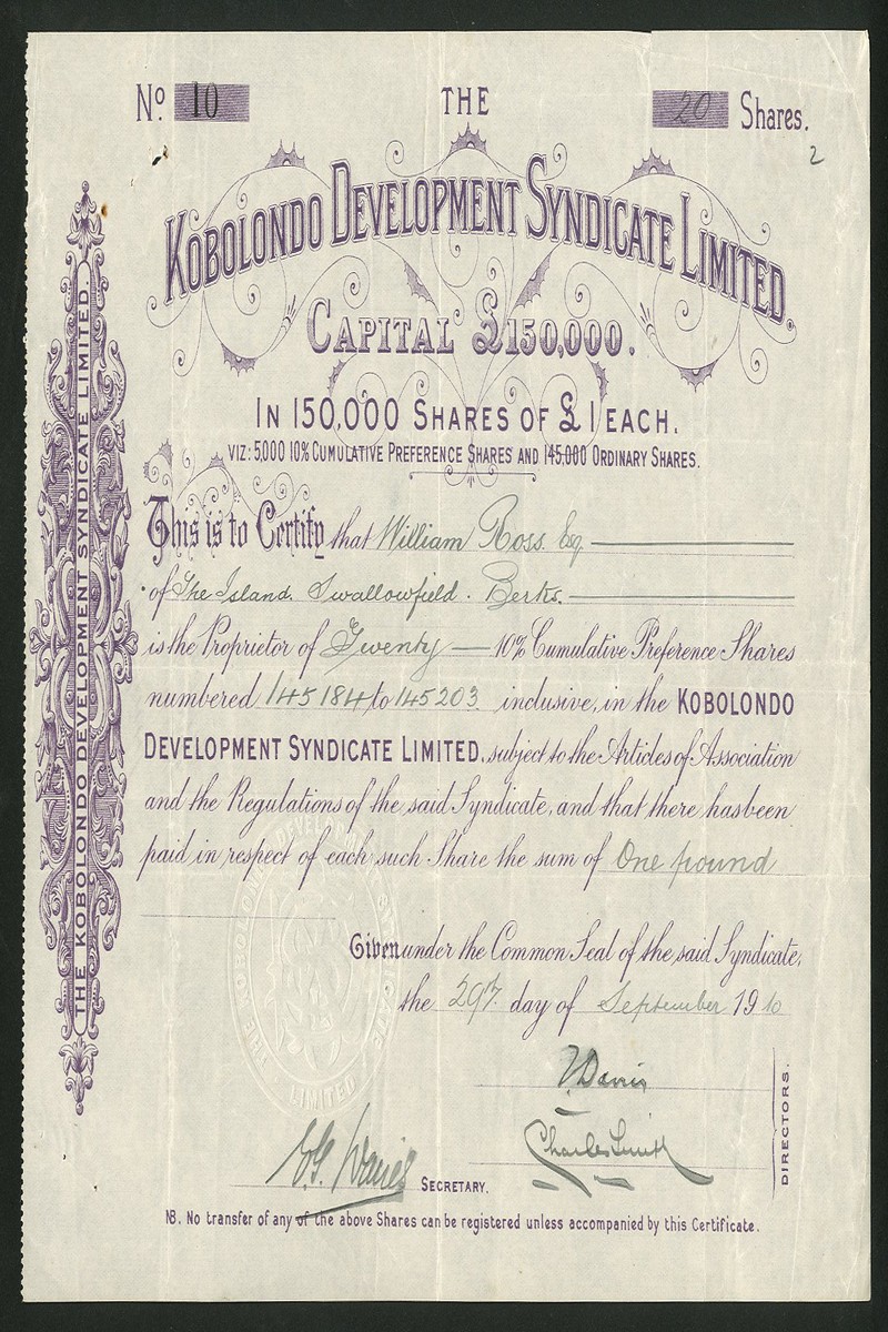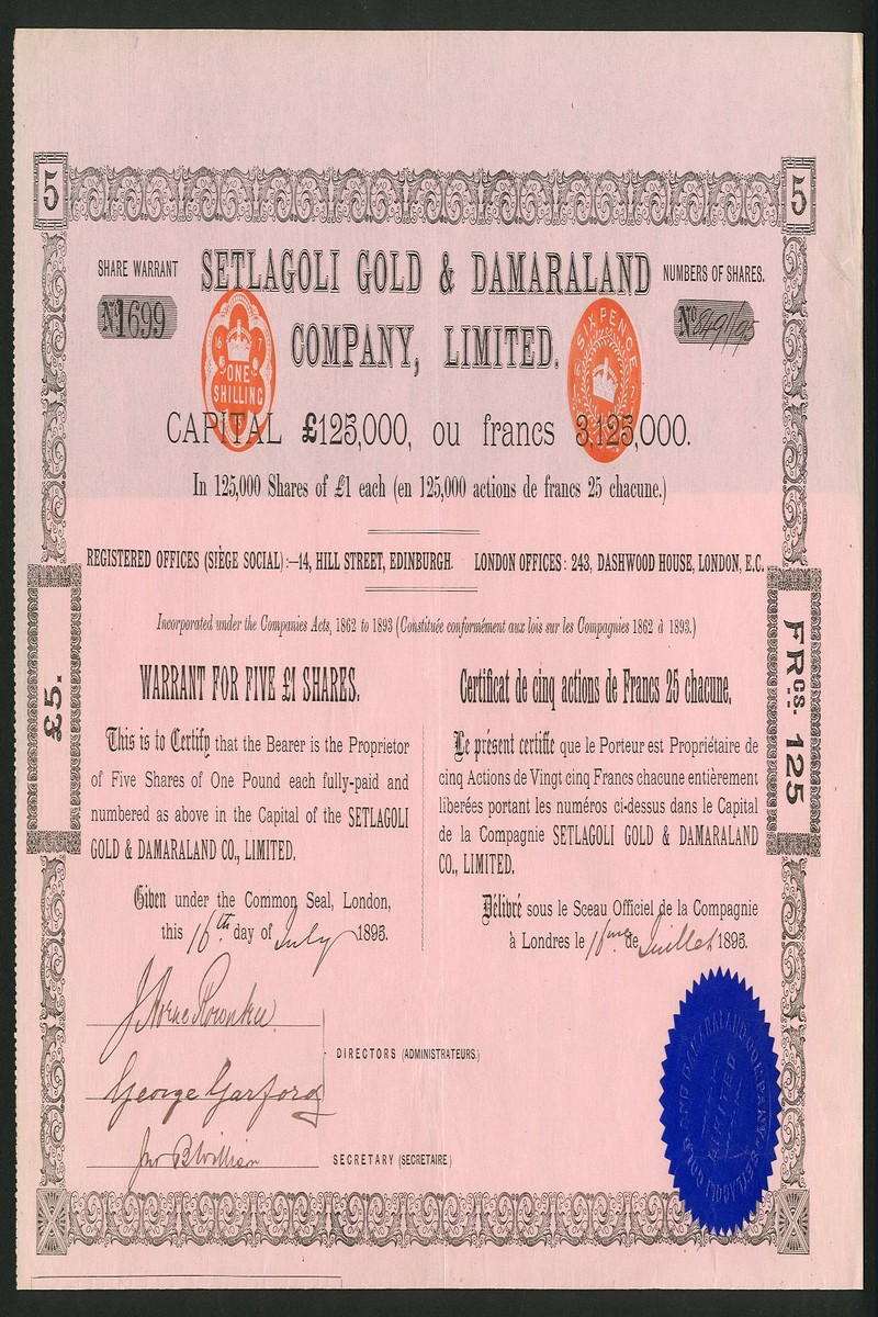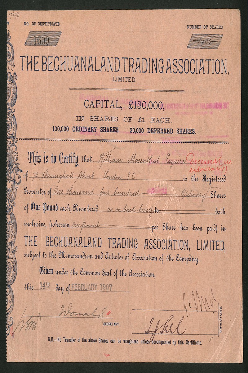 (x) An interesting group of mining and exploration companies comprising Setlagoli Gold & Damaraland Co. Ltd., bearer warrant for 5 shares of £1, London 1895, black on pink paper; Kobolobndo Development Syndicate Ltd., pair of certificates for £1 ordinary and £1 preference shares, 189[902] and 19[10]; Bechuanaland Trading Association Ltd., [1907]; Bird's Swaziland Concession Ltd., £1 shares, 188[99]; North Swazieland Syndicate Ltd., 18[94]; Port elizabeth Madibi Co. Ltd., [1907], and, Madibi Mines Ltd., 19[06], generally very fine. (8)