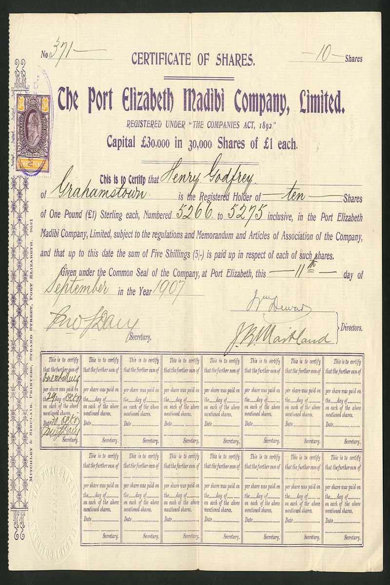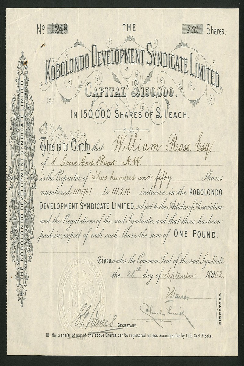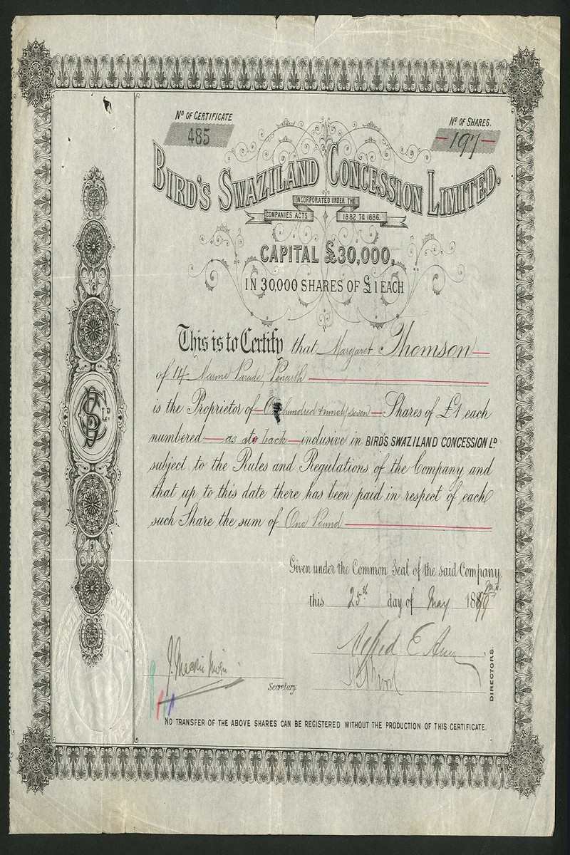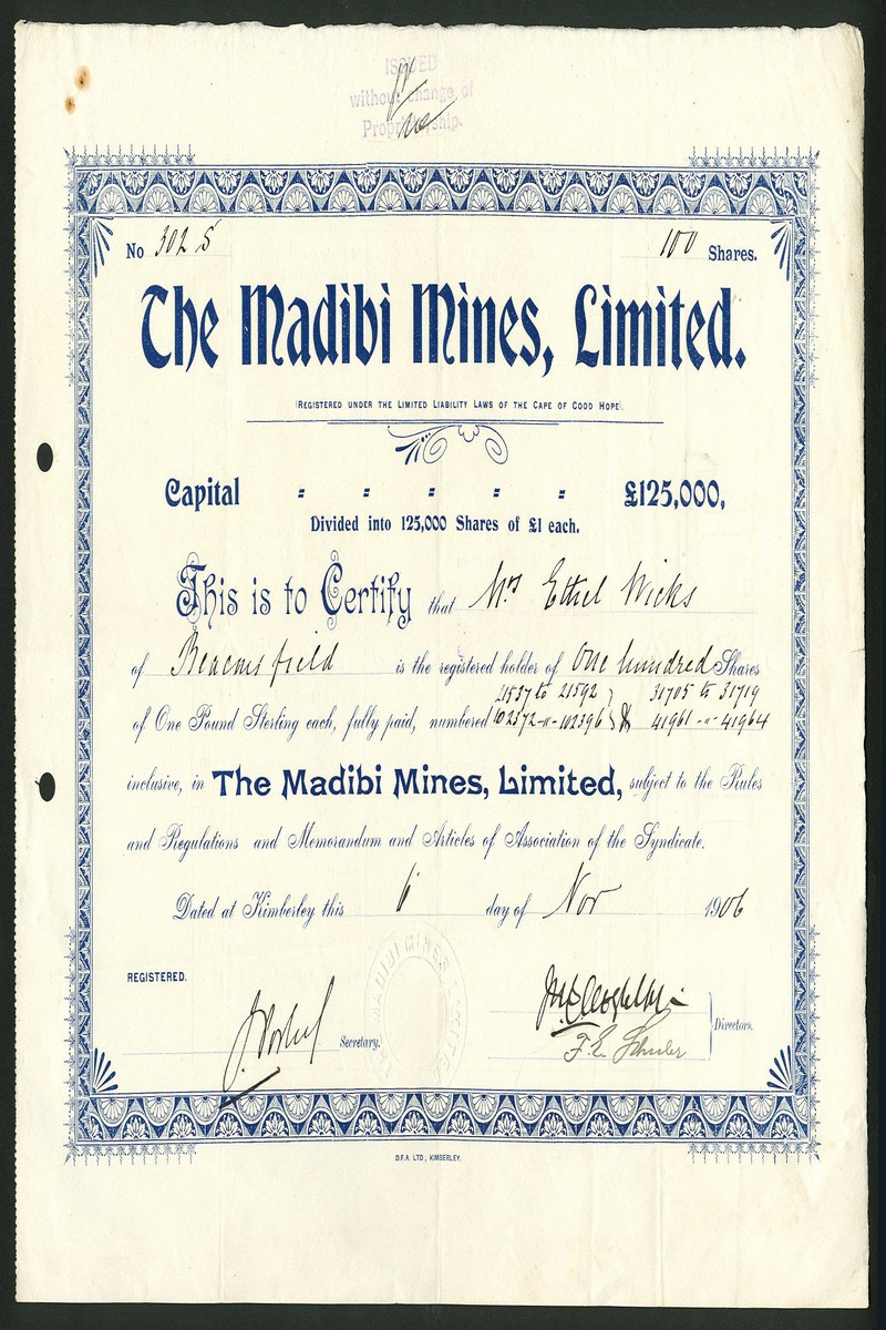 (x) An interesting group of mining and exploration companies comprising Setlagoli Gold & Damaraland Co. Ltd., bearer warrant for 5 shares of £1, London 1895, black on pink paper; Kobolobndo Development Syndicate Ltd., pair of certificates for £1 ordinary and £1 preference shares, 189[902] and 19[10]; Bechuanaland Trading Association Ltd., [1907]; Bird's Swaziland Concession Ltd., £1 shares, 188[99]; North Swazieland Syndicate Ltd., 18[94]; Port elizabeth Madibi Co. Ltd., [1907], and, Madibi Mines Ltd., 19[06], generally very fine. (8)