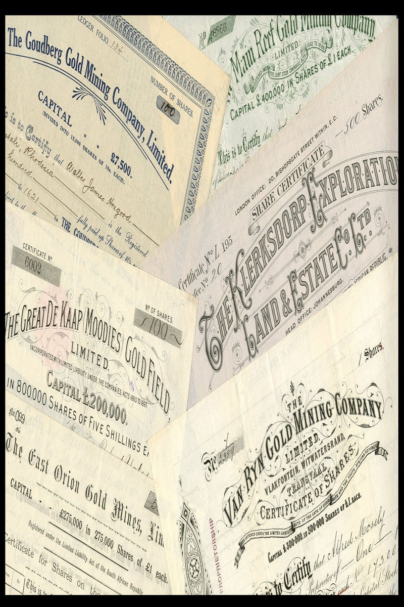 (x) A good group of gold mining companies comprising Van Ryn Gold Mining Co. Ltd., Vlakfontein, £1 shares, 18[90], black; East Orion Gold Mines Ltd., £1 shares, 189[5], black; Great de Kaap (Moodies) Gold Field Ltd., 5/- shares, 1[900], black; Klerksdorp Exploration Land & Estate Co. Ltd., £1 shares, 189[901], black, mauve underprint; Village Main Reef Gold Mining Co. Ltd., £1 shares, 190[5], green, and, Goudberg Gold Mining Co. Ltd., 10/- shares, 19[09], blue, red seal, very fine to extremely fine. (6)