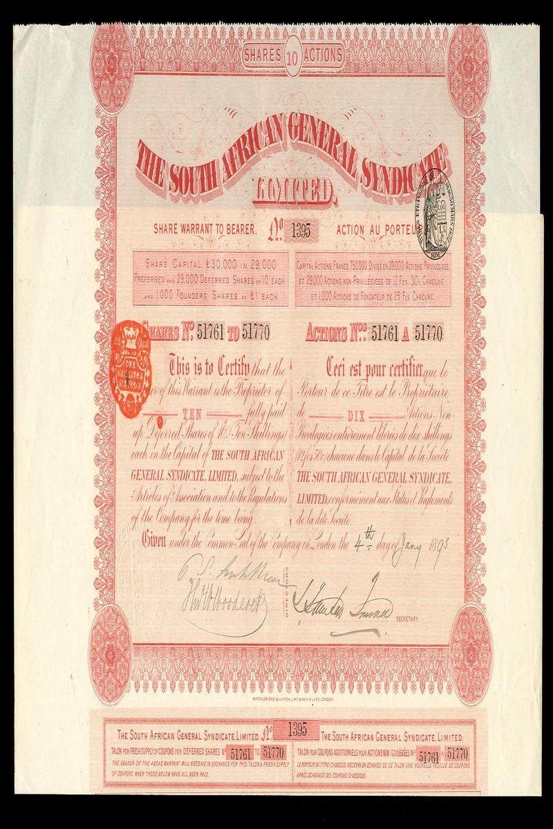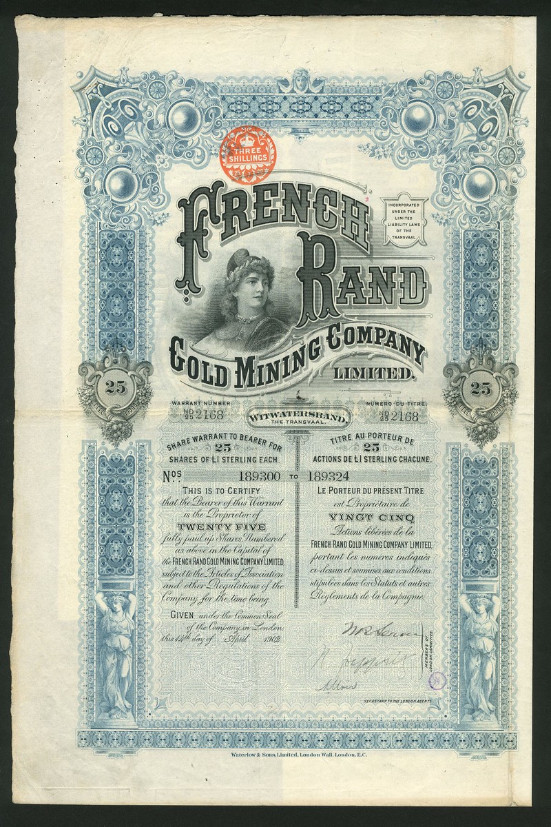 (x) A small group of South African 'bearer' certificates, all printed by Waterlow comprising South African General Syndicate Ltd., 10 deferred shares and 10 preferred shares, both 18[93], red and black, respectively; West Rand Mines Ltd., 25 shares of £1, 18[900], olive green and black, Holfontein (T.C.L.) Gold Mining Co. Ltd., 10 shares of 10/-, 19[37], brown and black; French Rand Gold Mining Co. Ltd., 1 share and 25 shares of £1, both 190[2], allegorical female, red and blue respectively, and Eastleigh Deep Ltd., 25 shares of £1, 189[5], blue and black, all with coupons, all except the last very fine or better. (7)