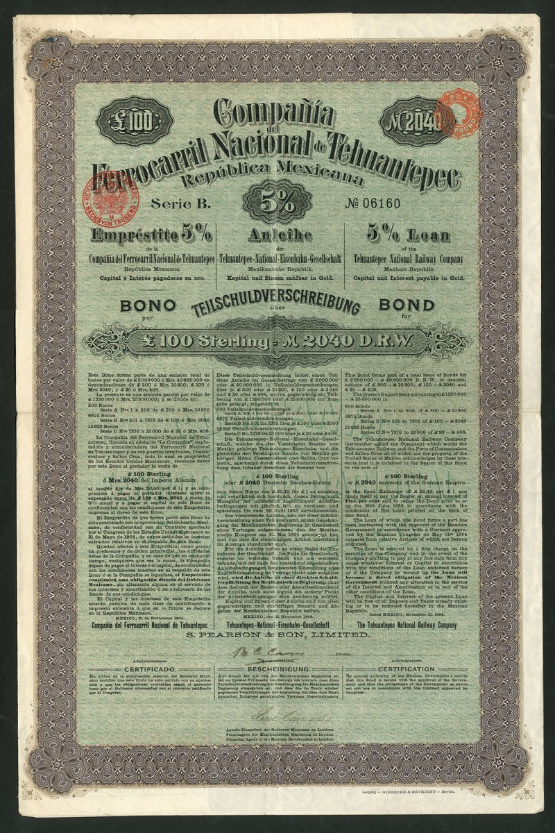 Ferrocarril Nacional de Tehuantepec, 5% Loan, 1904, a group of 6 bonds for £100/2040 marks, ornate border, mauve and black with green underprint, text in Spanish, German and English, with coupons, generally about very fine. (6)