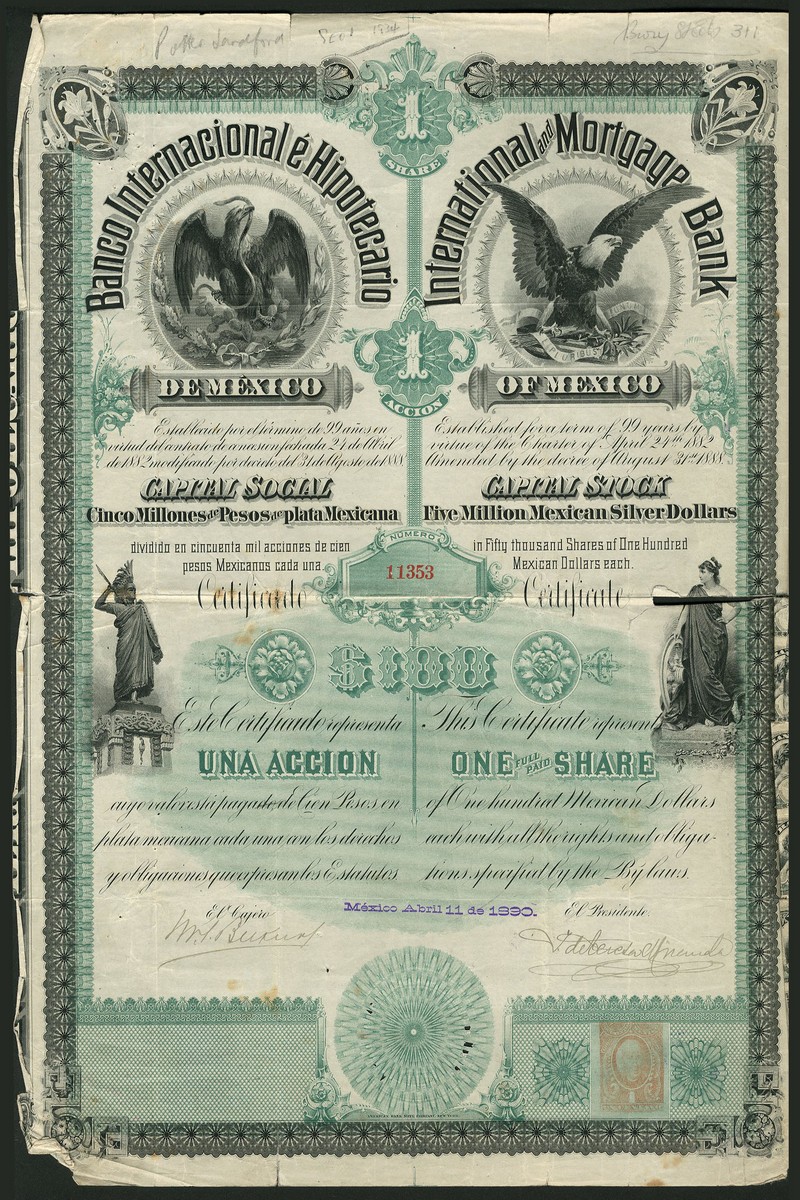 Banco Internacional é Hipotecario de México, 1 share of 100 pesos, 1890, no.11353, very attractive piece in both Spanish and English, Mexican and Amerian eagles at top, allegorical female and native american at either side, green and black, printed by ABNCo., with coupons, tears at folds and ragged edges, fine but rare