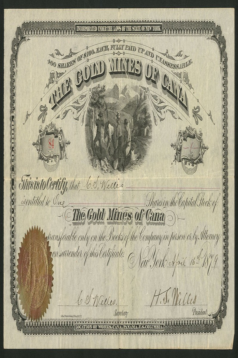 Panama: Gold Mines of Cana, $100 shares, New York 187[9], no.84, attractive certificate with vignette of miners working above ground, black, gold seal, very fine and scarce.