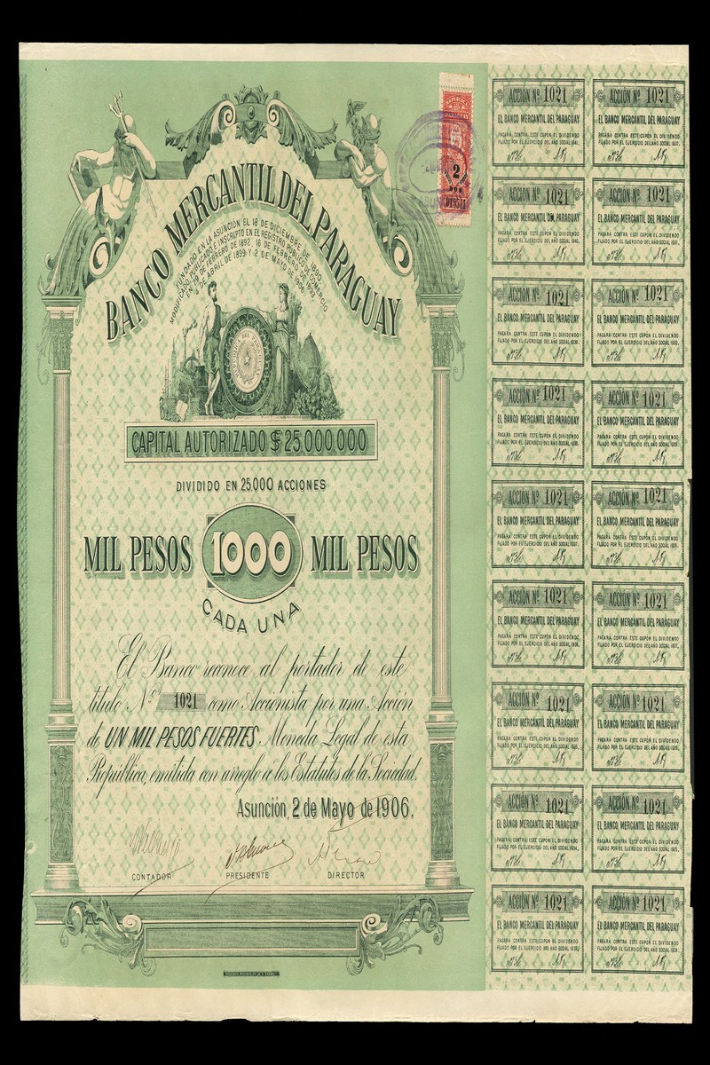 Banco Mercantil del Paraguay, ten pieces, 1000 peseta shares, Asunción 1906, nos.1021, 1022, 1023, 1024, 1025, 1026, 8940, 8942, 8942 and 8943, ornate border with columns at sides, Neptune and Mercury at top corners, black on green, all with coupons (some removed), generally very fine.(10)