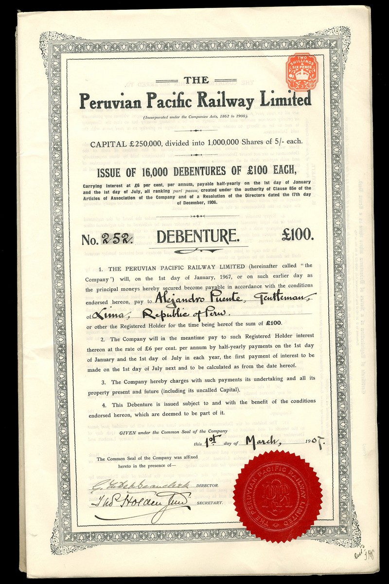 Peruvian Pacific Railway Ltd., a group of 12 debentures for £100, 19[07], large format, ornate border, black, red seal, 4 pages, all but the top one are about extremely fine although a little dusty. (12)