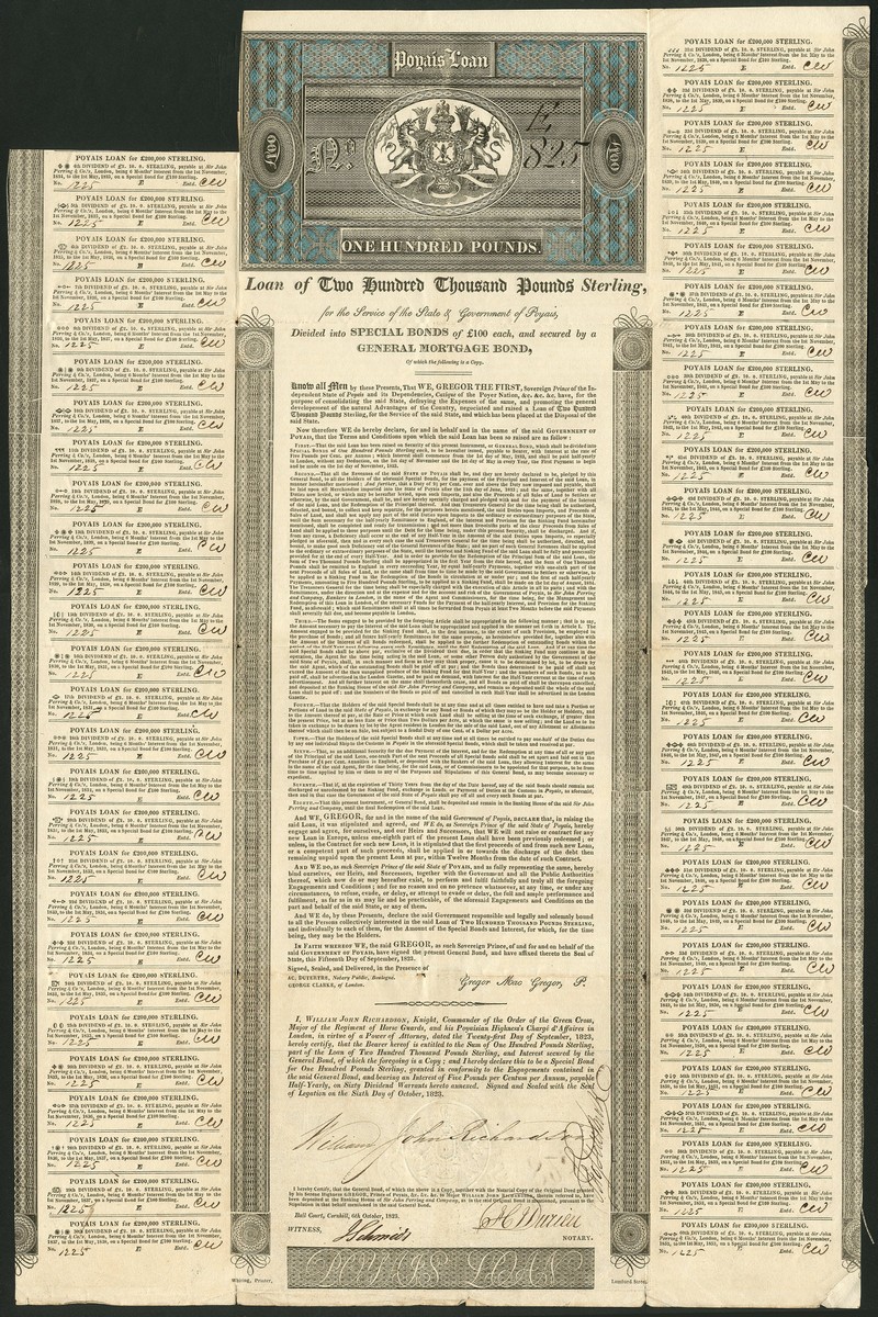 Poyais, General Mortgage Loan of £200,000, £100 special bond, 1823, no.825, signed by Major William John Richardson, MacGregor's Chargé d'Affaires in London, large format, black and blue printing by Whiting with classic scrollwork design at top, coupons at either side, folds wear slight wear in centre, couple of minor edge tears, very fine