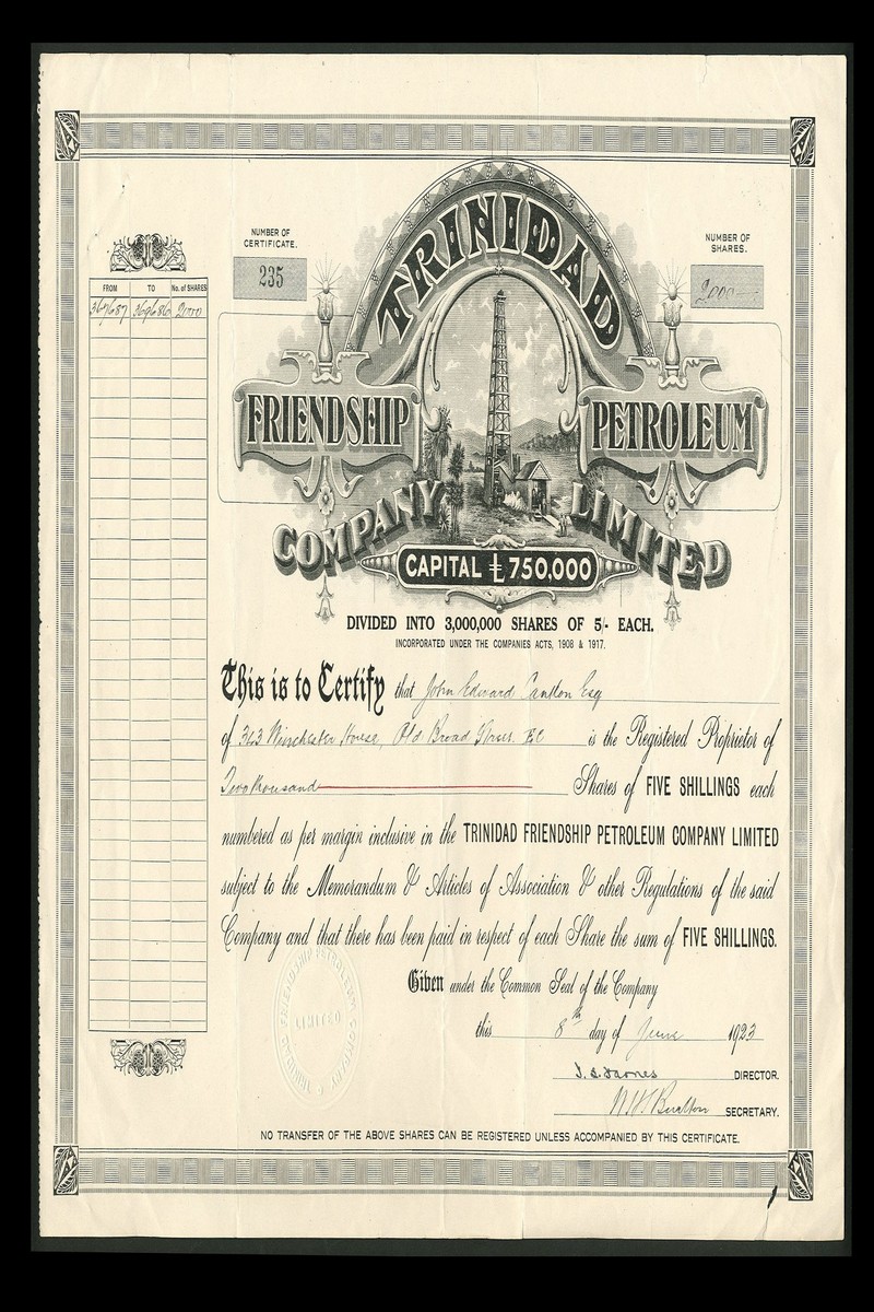 Trinidad Friendship Petroleum Co. Ltd., 5/- shares, 192[3], no.235, a very attractive large size certificate with vignette of oil derrick and building at top, black, couple of edge tears but very fine and scarce.
