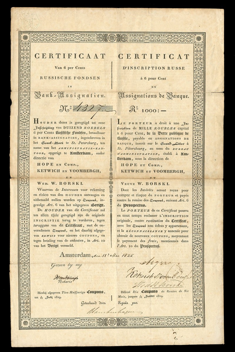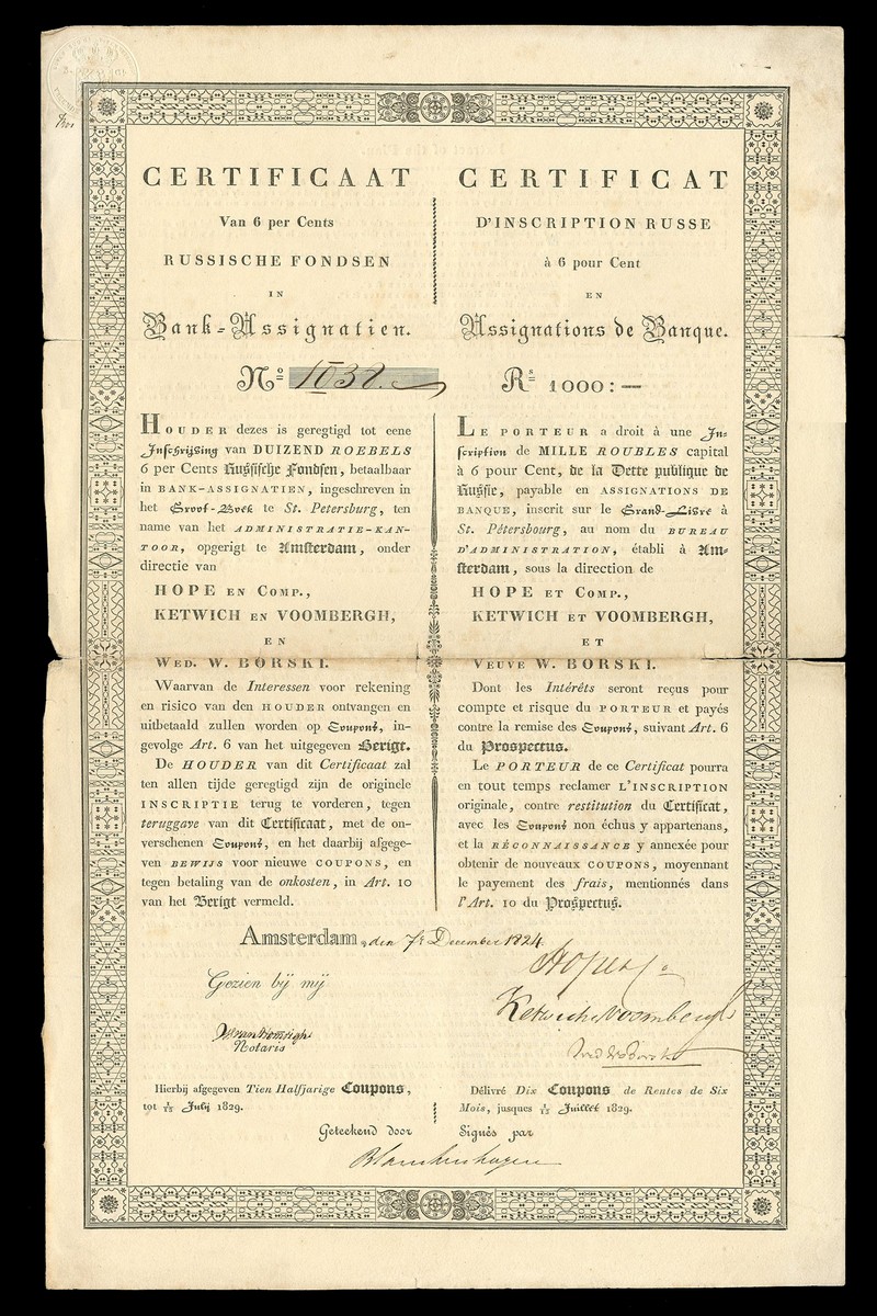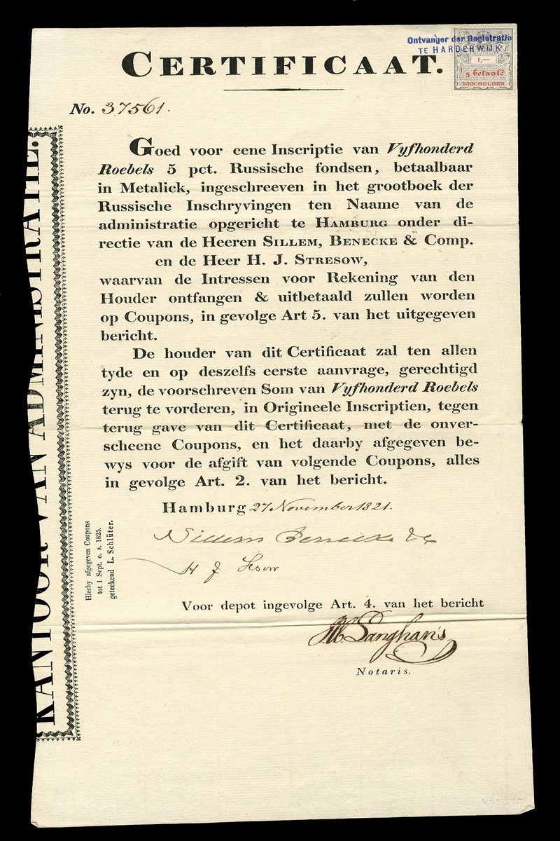 1820 5% Loan, a Dutch certificate issued in Hamburg in exchange for the original Russian issue by Dutch bankers Sillem, Benecke & Co., for 500 roubles silver, [1821], no.37561, together with 1817/18 6% Perpetual Annuities, Dutch certificates isued by Hope & Co. (5), three different printings, some lacking coupons, mixed condition, fine and better. (6)