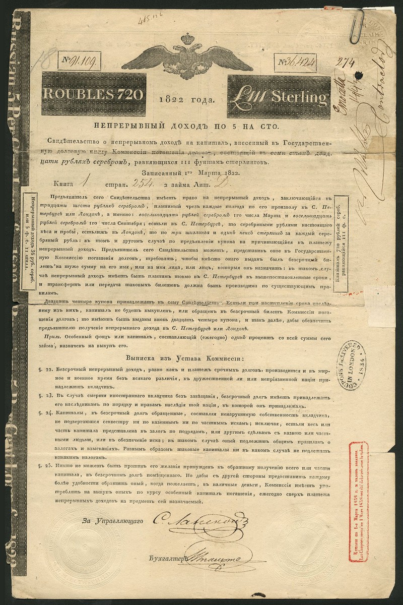1822, 5% Rothschild Loan, bond for 720 roubles or £111, hand signed by Nathan Meyer Rothschild, double headed eagle at top, black, 1 coupon, repaired tears, split on fold, fine to very fine