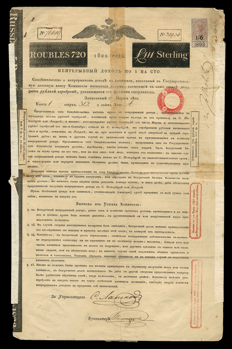 1822 5% 'Rothschild' Loan, bond for 720 roubles or £111, handsigned by Nathan Meyer Rothschild as Contractor, double headed eagle at top, black, on poor quality paper, with talon, split at folds with old tape repair, good fine