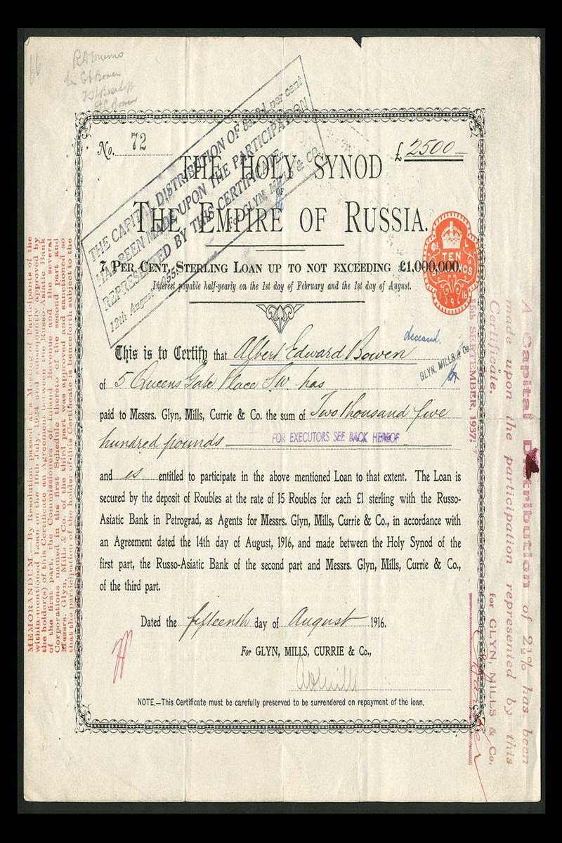 Holy Synod of the Empire of Russia, 7% Sterling Loan, a certificate for £[2500], 1916, no.72, issued by Glyn, Mills, Currie & Co. as agents for the loan, black, text in English, numerous overprints regarding repayment of capital as late as 1955, edge splits, fine to very fine, scarce and interesting.