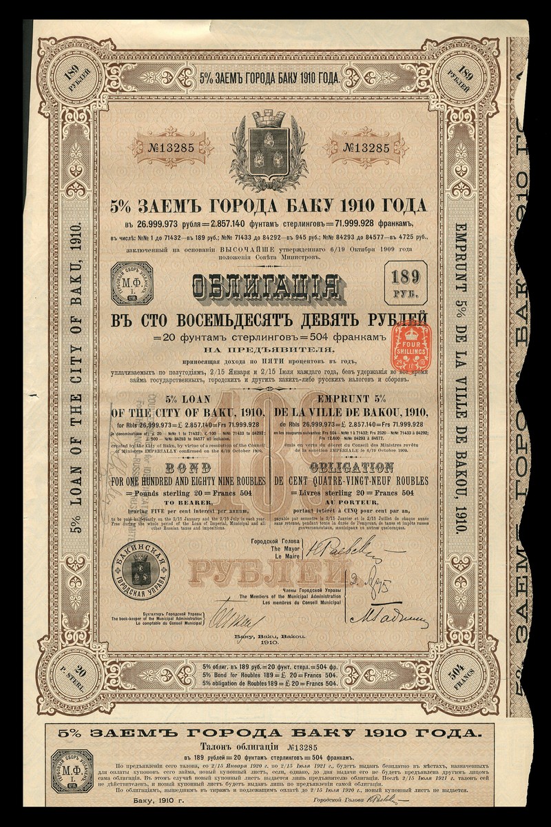 (x) City of Baku, 5% Loan, 1910, £20 bonds (100), ornate borders, coat of arms at top, brown, with coupons, generally very fine. (100)