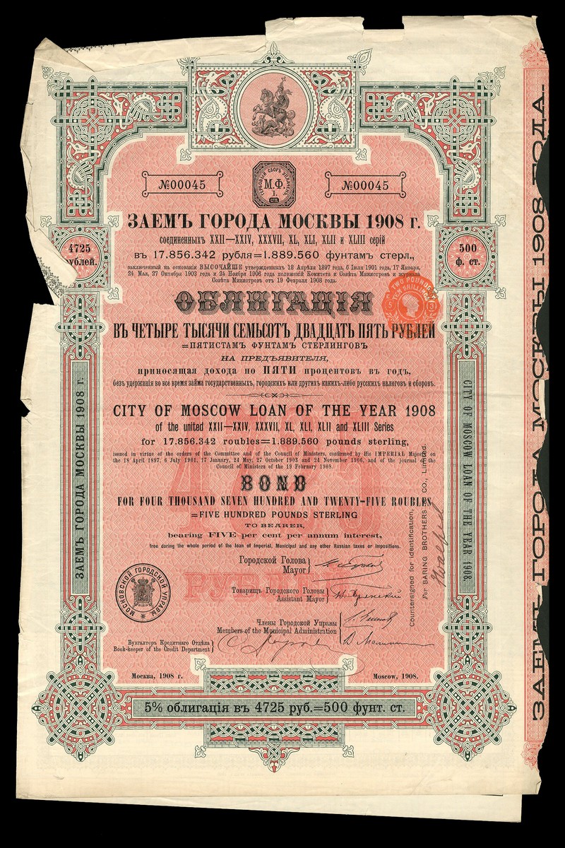 (x) City of Moscow 5% Loan, 1908, a group of £500 bonds (11), rare, only 400 bonds issued, city coat of arms at top, ornate borders, red and green, countersigned by Baring Brothers & Co. Ltd., with coupons, mixed with some border damage, generally poor to fair. (11)