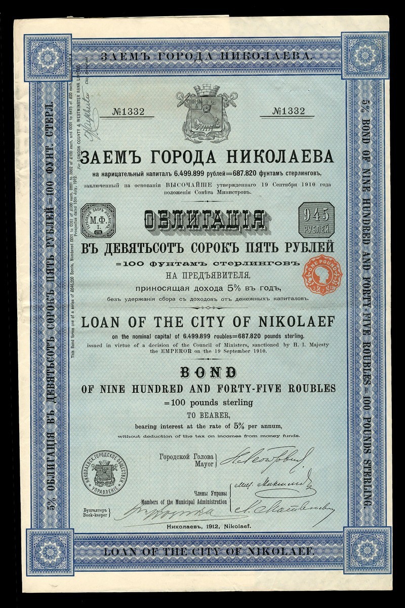 (x) City of Nikolaef 5% Loan, 1912, a group of 85 £100 bonds, arms at top, ornate borders, blue, with coupons, very fine to extremely fine. (85)