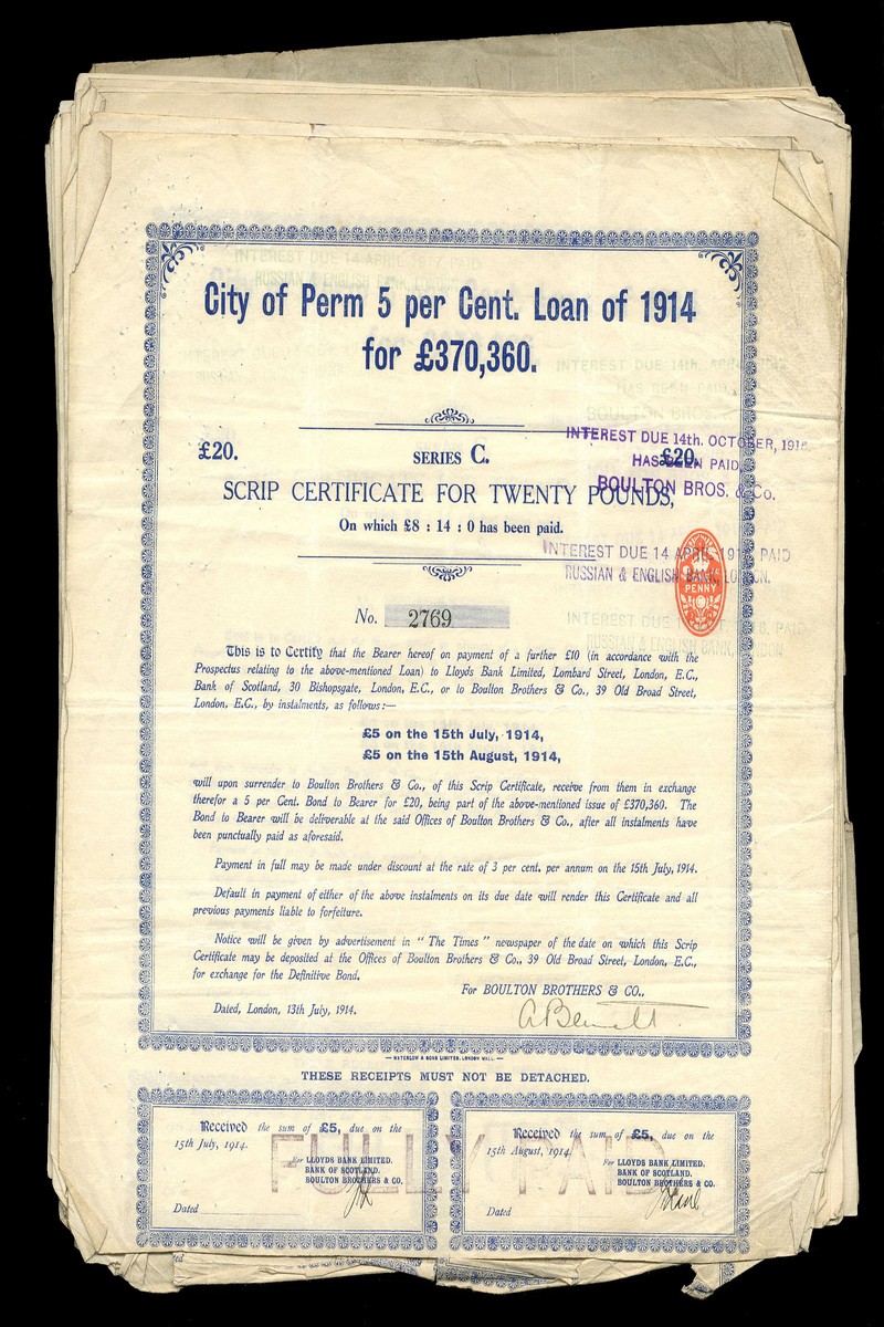 (x) City of Perm 5½% Loan, 1914, scrip certificates for £20 (40), ornate borders, blue, issued Boulton Brothers, generally very fine. (40)