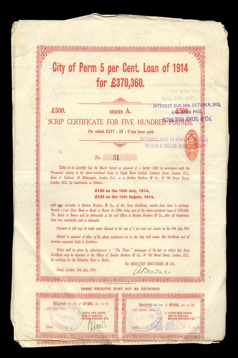 (x) City of Perm 5½% Loan, 1914, scrip certificates for £500 (7), rare, ornate borders, red, issued Boulton Brothers, very fine. (7)