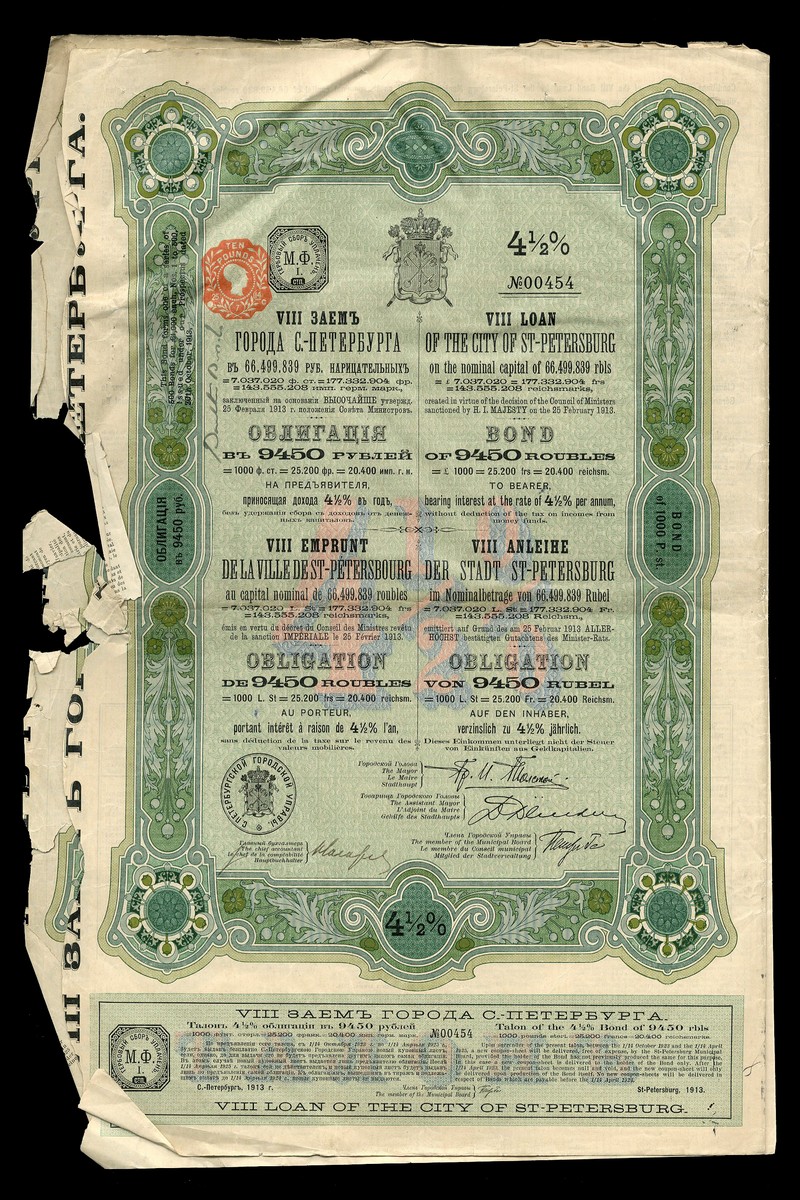 (x) City of St. Petersburg, 4½% Loan, 1913, £1000 bonds (3), rare, only 500 issued, ornate borders, coat of arms at top, blue and green, with coupons, poor to fine some damage to borders. (3)
