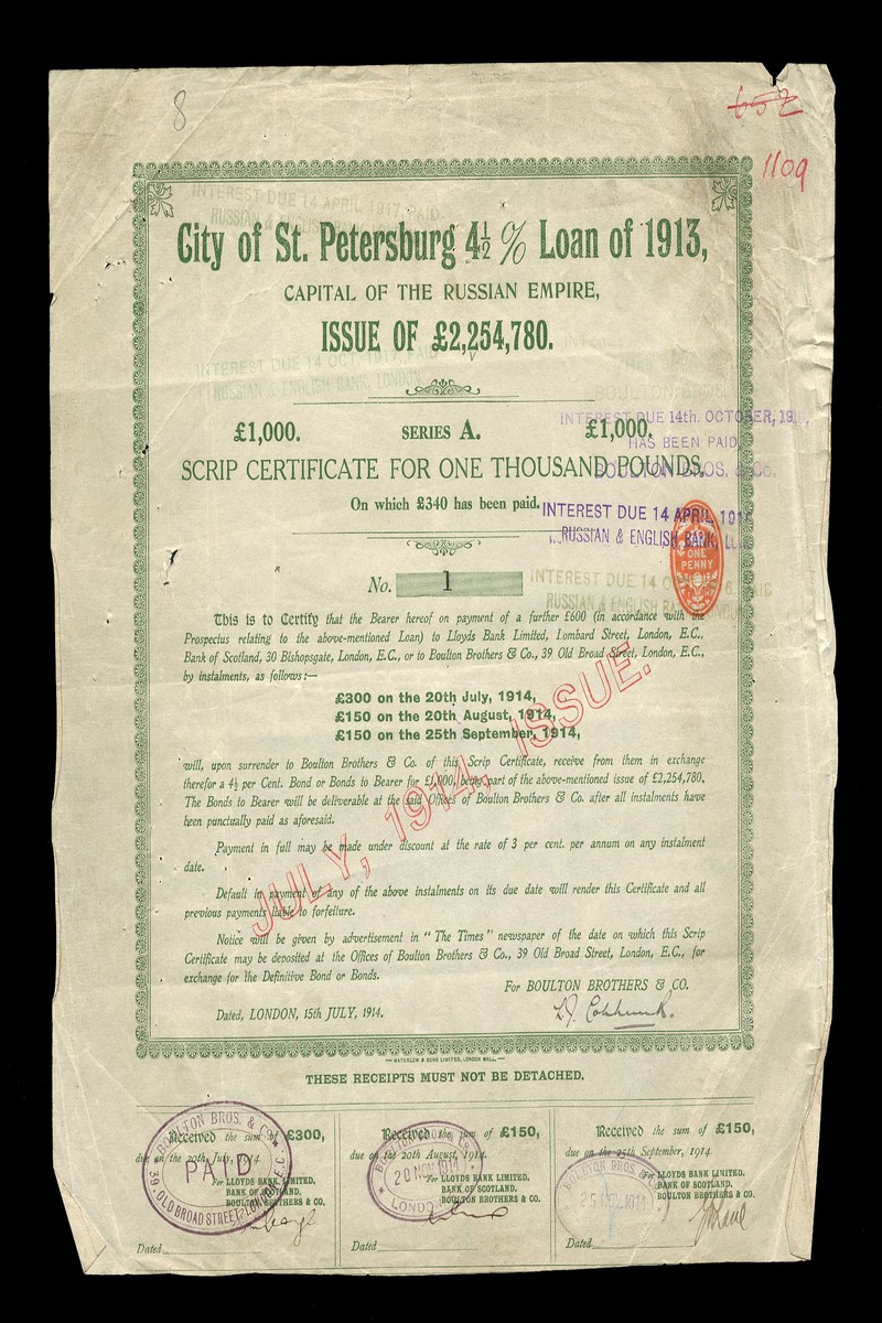 (x) City of St Petersburg 4½% Loan, 1913, scrip certificate for £1000, Series A, Number 1, ornate borders, green, overprinted "July 1914, issue", issued Boulton Brothers, very fine. (1)