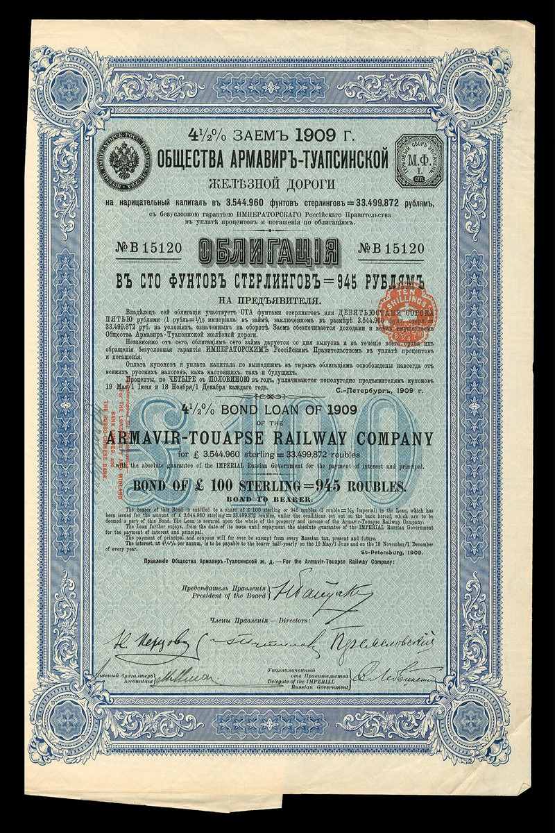 (x) Armavir-Touapse Railway Company 4½% Loan, 1909, £100 bonds (80), ornate border, blue, with coupons, mostly very fine. (80)