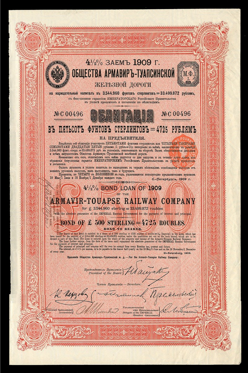 Armavir-Touapse Railway Company, 4½% Loan, 1909, bond for £500, no.C00496, red and black, with coupons, almost extremely fine.