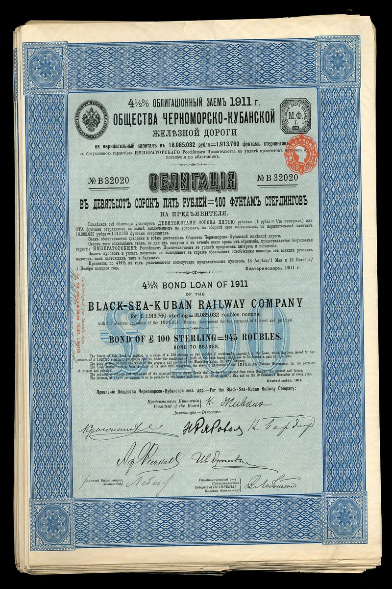 (x) Black-Sea-Kuban Railway Company, 4½% Loan, 1911, 45 bonds for £100, ornate border, blue, text in English and Russian, coupons, generally very fine (45)