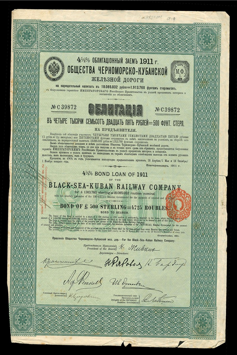 (x) Black-Sea-Kuban Railway Company 4½% Loan, 1911, bond for £500 no. C39872, of only 400 issued, ornate border, green, text in English and Russian, with coupons, small tears bottom edge otherwise fine to very fine.
